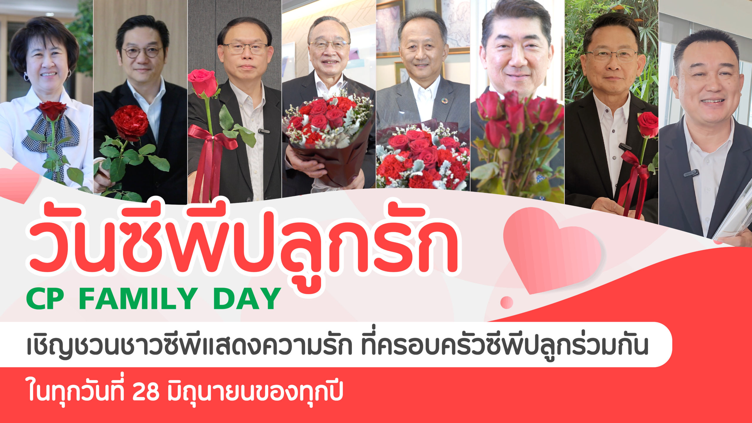 ผู้บริหารและพนักงานบริษัทในเครือซีพี อาทิ คุณอดิเรก ศรีประทักษ์ รองประธานอาวุโส เครือฯ คุณประสิทธิ์ บุญดวงประเสริฐ ประธานคณะผู้บริหาร ซีพีเอฟ คุณวิเศษ วิศิษฏ์วิญญู กรรมการผู้จัดการ ซีพีแรม คุณยุทธศักดิ์ ภูมิสุรกุล ประธานเจ้าหน้าที่บริหาร ซีพี ออลล์ คุณวิเชียร จึงวิโรจน์ กรรมการผู้จัดการ (ร่วม) ซีพี ออลล์ คุณวิชัย จันทร์จริยากุล กรรมการผู้จัดการ (ร่วม) ซีพี ออลล์ คุณมนัสส์ มานะวุฒิเวช ประธานคณะผู้บริหาร บริษัท ทรู คอร์ปอเรชั่น จำกัด (มหาชน) คุณศรินทร์รา วงศ์ศุภลักษณ์ หัวหน้าคณะผู้บริหารด้านทรัพยากรบุคคล ทรู คอร์ปอเรชั่น จำกัด (มหาชน) และเพื่อนพนักงานร่วมกันมอบดอกกุหลาบสีแดงแทนสัญลักษณ์ความขอบคุณต่อ ผู้บริหาร หัวหน้า เพื่อนร่วมงาน และครอบครัว ที่เป็นส่วนหนึ่งของกำลังใจและคอยผลักดันจนประสบความสำเร็จในการทำงาน โดยเฉพาะท่านประธานอาวุโสธนินท์ เจียรวนนท์ ผู้นำของครอบครัวซีพี คุณสุภกิต เจียรวนนท์ ประธานกรรมการเครือซีพี และคุณศุภชัย เจียรรวนนท์ ประธานคณะผู้บริหารเครือซีพี ที่ทุ่มเทเสียสละทำให้องค์กรมีความเจริญก้าวหน้าอย่างไม่หยุดยั้ง และยังทำประโยชน์เพื่อประเทศชาติ โดยยึดหลัก 3 ประโยชน์ เพื่อประเทศชาติ ประชาชน และองค์กร จนเครือซีพีเติบโตมากว่า 100 ปี นอกจากนี้ บุคคลสำคัญที่ทุกคนอยากมอบดอกกุหลาบเพื่อแทนความรักและคำขอบคุณคือ ครอบครัว ที่คอยดูแลและอยู่เคียงข้างกันเสมอมา พร้อมกันนี้ ยังได้เชิญชวนผู้บริหารและเพื่อนพนักงานในเครือซีพีร่วมกันแสดงออกถึงความรักต่อคนรอบตัว เพื่อให้กำลังใจต่อกัน ในทุกวันที่ 28 มิถุนายนของทุกปี