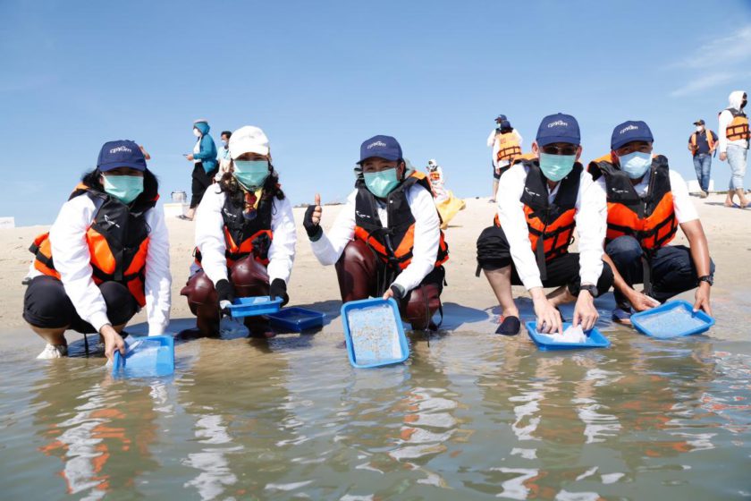 คุณวิเศษ วิศิษฏ์วิญญู กรรมการผู้จัดการ พร้อมด้วยผู้บริหารและพนักงาน บริษัท ซีพีแรม จำกัด รวมถึงส่วนราชการ และชาวบ้าน จังหวัดสุราษฎร์ธานี เดินหน้าสานต่อโครงการ “ปูม้า ยั่งยืน คู่ทะเลไทย” มุ่งหวังเพื่อสร้างสมดุลระบบนิเวศบนท้องทะเลไทย ส่งเสริมให้เกิดความมั่นคง และยั่งยืนทางอาหาร โดยปล่อยลูกพันธุ์ปูม้าในระยะ Young Crab ซึ่งเป็นระยะลูกปูม้าที่เหมาะกับการปล่อยลง สู่ทะเลที่มีโอกาสรอดสูง ณ บริเวณเกาะเสร็จ อำเภอไชยา จังหวัดสุราษฎร์ธานี จวบจนปัจจุบันรวมกว่าล้านตัว พร้อมปลูกป่าชายเลน และเก็บขยะบริเวณโดยรอบพื้นที่เกาะ ซึ่งเป็นหนึ่งในภารกิจขับเคลื่อนยุทธศาสตร์ความมั่นคงทางอาหาร ตามแนวทาง FOOD 3S ขององค์กร