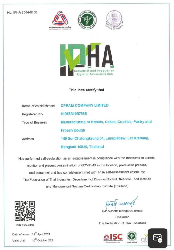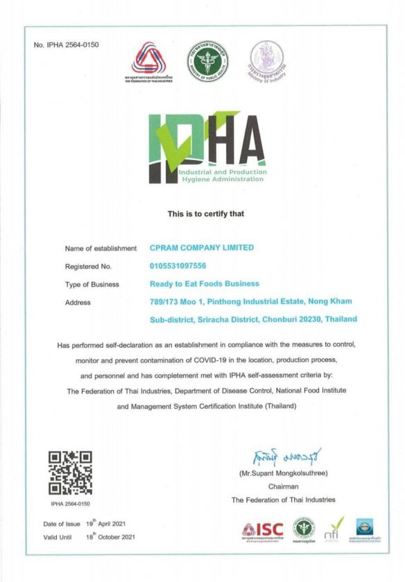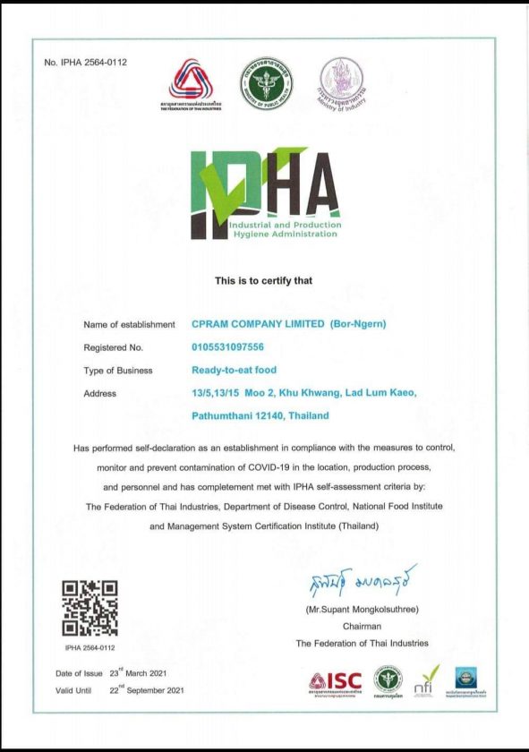 บริษัท ซีพีแรม จำกัด ผู้นำธุรกิจอาหารพร้อมรับประทาน ได้รับการรับรองมาตรฐาน IPHA การันตีคุณภาพ และความปลอดภัยอาหารสูงสุด ตลอดกระบวนการผลิต สร้างความเชื่อมั่นต่อผู้บริโภค ในการให้ความสำคัญสูงสุดของการควบคุมคุณภาพ ประกันคุณภาพ และความปลอดภัยทางอาหาร รวมถึงป้องกันการปนเปื้อน COVID-19 อย่างเข้มงวดและเคร่งครัด ตลอดทั้งห่วงโซ่อุปทานของการผลิตอาหาร อาทิ ด้านวัตถุดิบ ด้านการผลิตสินค้า ด้านบรรจุภัณฑ์ ด้านกระบวนการจัดส่ง เป็นต้น โดยจัดตั้งคณะกรรมการบริหารในสถานการณ์การระบาดของโรคติดเชื้อไวรัส COVID-19 ในการเฝ้าระวัง และติดตามสถานการณ์กรณี COVID-19 อย่างใกล้ชิดและต่อเนื่อง
