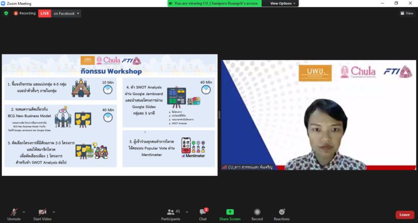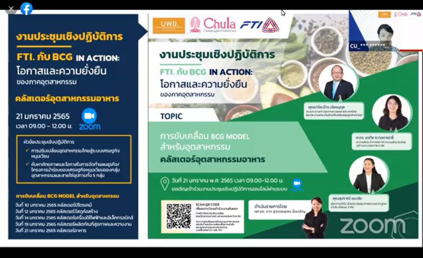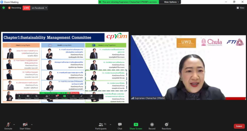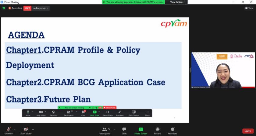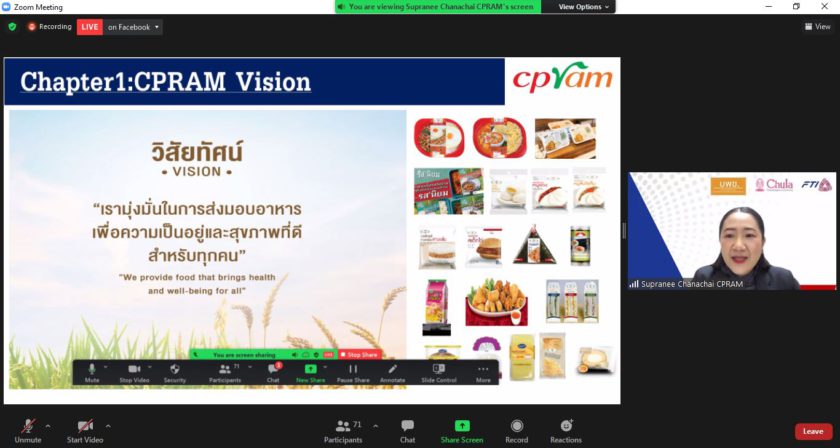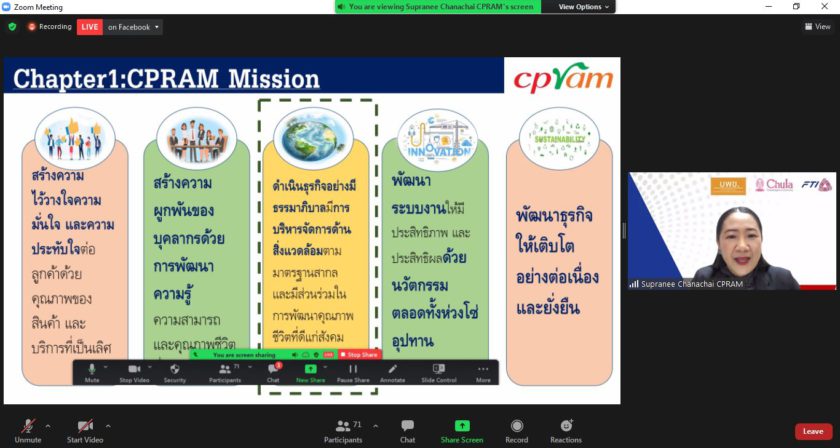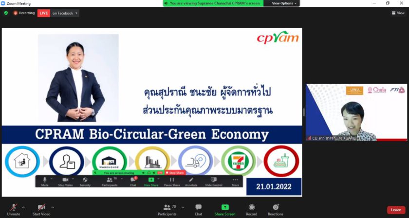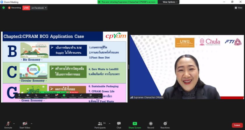คุณสุปราณี ชนะชัย ผู้จัดการทั่วไป บริษัท ซีพีแรม จำกัด ให้เกียรติร่วมแลกเปลี่ยนประสบการณ์ และถ่ายทอดองค์ความรู้ในงานประชุมเชิงปฏิบัติการ FTI. กับ BCG IN ACTION: โอกาสและความยั่งยืนของภาคอุตสาหกรรม “โครงการขับเคลื่อน BCG Model สำหรับสภาอุตสาหกรรม” คลัสเตอร์อุตสาหกรรมอาหาร ในหัวข้อ “ประสบการณ์และความสำเร็จในการดำเนินการด้านเศรษฐกิจหมุนเวียน” จัดโดย ภาควิชาวิศวกรรมสิ่งแวดล้อม คณะวิศวกรรมศาสตร์ จุฬาลงกรณ์มหาวิทยาลัย ร่วมกับ สภาอุตสาหกรรมแห่งประเทศไทย และหน่วยบริหารและจัดการทุนด้านการเพิ่มความสามารถในการแข่งขันของประเทศ (บพข.) ผ่านระบบออนไลน์ Zoom Meeting โดยภายในงานประชุมมีการระดมสมองในการค้นหาศักยภาพ และร่วมคัดเลือกโครงการ ให้เกิด Champion Project เพื่อนำไปสู่การต่อยอดในการจัดทำแผนธุรกิจต่อไป