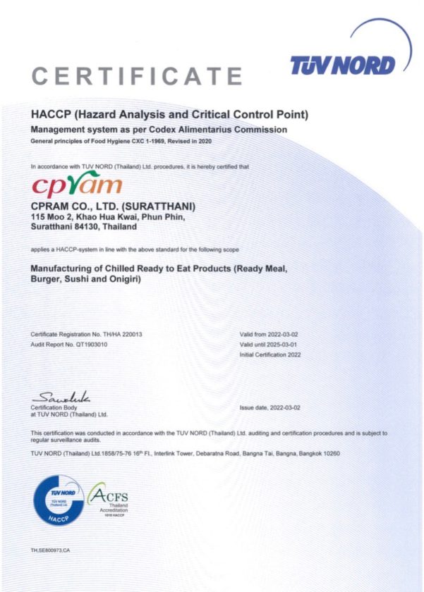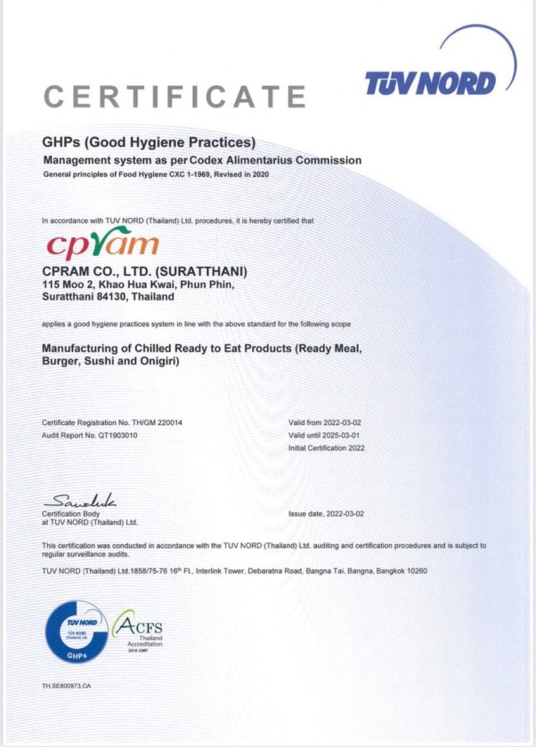 บริษัท ซีพีแรม จำกัด (สุราษฎร์ธานี) ได้ผ่านการรับรองระบบการจัดการคุณภาพ “GHPs & HACCP” (Good Hygiene Principles and Hazard Analysis and Critical Control Point) Revised in 2020 ซึ่งเป็นระบบมาตรฐานการปฏิบัติสุขลักษณะที่ดี ผ่านการวิเคราะห์อันตราย และจุดวิกฤตต่างๆ ที่ต้องควบคุมในการผลิตอาหารให้ได้ตามมาตรฐานที่กำหนด ตลอดทั้งห่วงโซ่อาหาร เพื่อส่งมอบอาหารที่ปลอดภัยให้แก่ผู้บริโภค