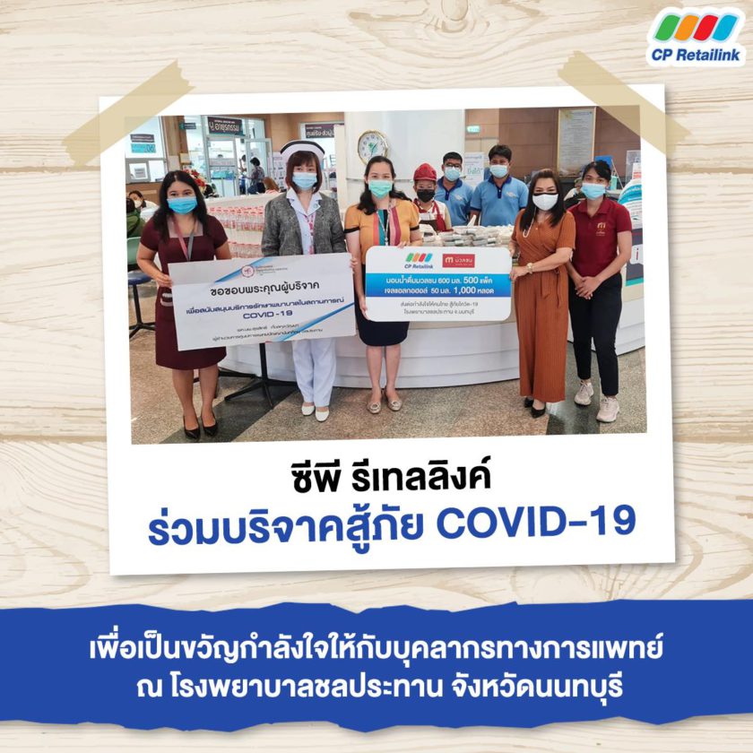 บริษัท ซีพี รีเทลลิงค์ จำกัด ร่วมบริจาคสู้ภัย COVID-19 ระลอกใหม่มอบน้ำดื่มแบรนด์มวลชนขนาด 600 มิลลิลิตร จำนวน 500 แพ็ค และเจลแอลกอฮอล์ 50 มิลลิลิตร จำนวน 1,000 หลอด เพื่อเป็นส่วนหนึ่งในการส่งกำลังใจให้กับบุคลากรทางการแพทย์ ณ โรงพยาบาลชลประทาน จังหวัดนนทบุรี ในวันพุธที่ 5 พฤษภาคม 2564