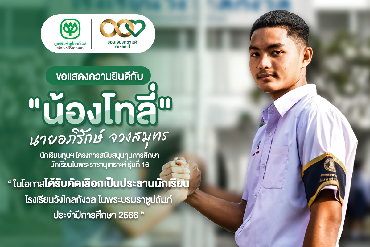 มูลนิธิเจริญโภคภัณฑ์พัฒนาชีวิตชนบท ขอแสดงความยินดีกับ “น้องโทลี่” อภิรักษ์ จวงสมุทร นักเรียนทุนฯ รุ่น 16 ในโครงการสนับสนุนทุนการศึกษานักเรียนในพระราชานุเคราะห์ ระดับชั้นมัธยมศึกษาปีที่ 5 แผนการเรียนวิทย์-คณิต โรงเรียนวังไกลกังวล ในพระบรมราชูปถัมภ์ ได้รับคัดเลือกให้เป็นประธานนักเรียน และคณะกรรมการสภานักเรียนโรงเรียนวังไกลกังวล ในพระบรมราชูปถัมภ์ ประจำปีการศึกษา 2566 ด้วยคะแนนเสียงท่วมท้น นับเป็นนักเรียนทุนฯ คนที่ 7 ที่ได้รับโอกาสนี้