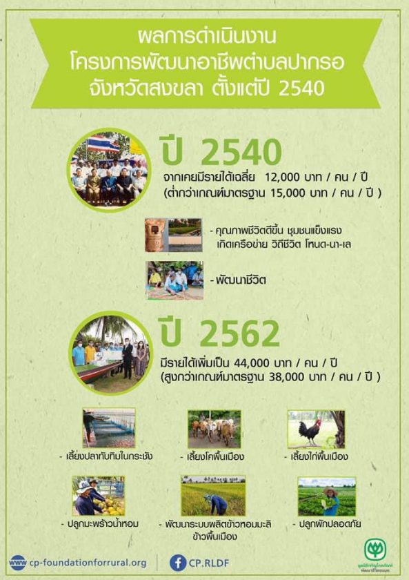 คุณชาญวิทย์ รัตนชาติ ผู้รับผิดชอบโครงการพัฒนาอาชีพปากรอ มูลนิธิเจริญโภคภัณฑ์พัฒนาชีวิตชนบท เปิดเผยถึงประสบการณ์และบทเรียนจากการทำงานกับชุมชนในตำบลปากรอว่า การที่จะพัฒนาชุมชนให้หลุดพ้นจากความยากจนและกลายมาเป็นแหล่งสร้างรายได้นั้น จะต้องเริ่มจากการสร้างอารมณ์ความรู้สึกร่วม รู้ว่าความต้องการของชุมชนคืออะไร แสดงถึงความจริงใจและมีความเป็นเพื่อนกับคนในชุมชน สร้างกระบวนการเรียนรู้ สร้างความเชื่อ ความศรัทธาที่ไปในทิศทางเดียวกัน