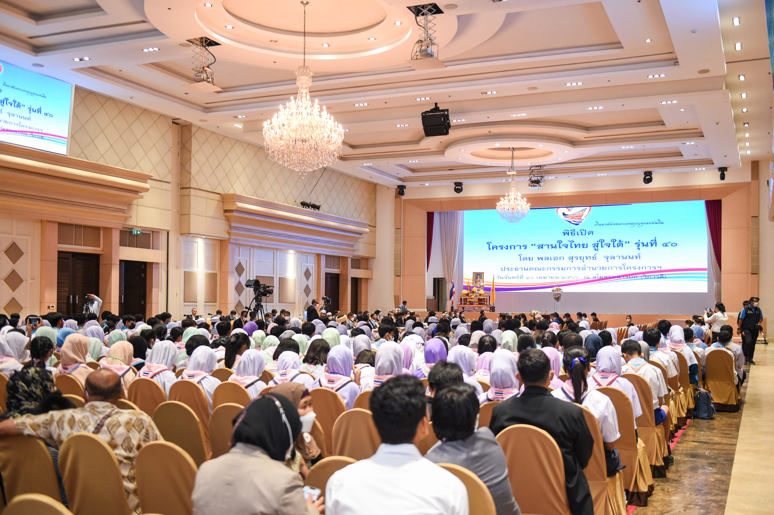 (10 เม.ย. 66) พลเอกสุรยุทธ์ จุลานนท์ ประธานองคมนตรี ในฐานะประธานคณะกรรมการอำนวยการโครงการ “สานใจไทย สู่ใจใต้” เป็นประธานในพิธีเปิดโครงการ “สานใจไทย สู่ใจใต้” รุ่นที่ 40 โดยมีส่วนราชการ ภาครัฐ ภาคเอกชน ครอบครัวอุปถัมภ์ และเยาวชนจากพื้นที่ 5 จังหวัดชายแดนใต้ พร้อมด้วย พลเอกพงษ์เทพ เทศประทีป เลขาธิการมูลนิธิรัฐบุรุษ พลเอกเปรม ติณสูลานนท์, พลเอกประดิษฐ์ บุญเกิด เลขาธิการมูลนิธิพิทักษ์อุทยานแห่งชาติเขาใหญ่ , พลเอกภุชพงศ์ พงษ์ศิริ เลขาธิการมูลนิธิรักเมืองไทย และ นายจอมกิตติ ศิริกุล รองกรรมการผู้จัดการใหญ่อาวุโสด้านพัฒนาความยั่งยืนภาครัฐและกิจการสัมพันธ์ เครือเจริญโภคภัณฑ์ และผู้ช่วยบริหารสำนักประธานคณะกรรมการบริหาร บริษัท เจริญโภคภัณฑ์อาหาร จำกัด (มหาชน) เข้าร่วม ณ สโมสรทหารบก ถนนวิภาวดี กรุงเทพฯ