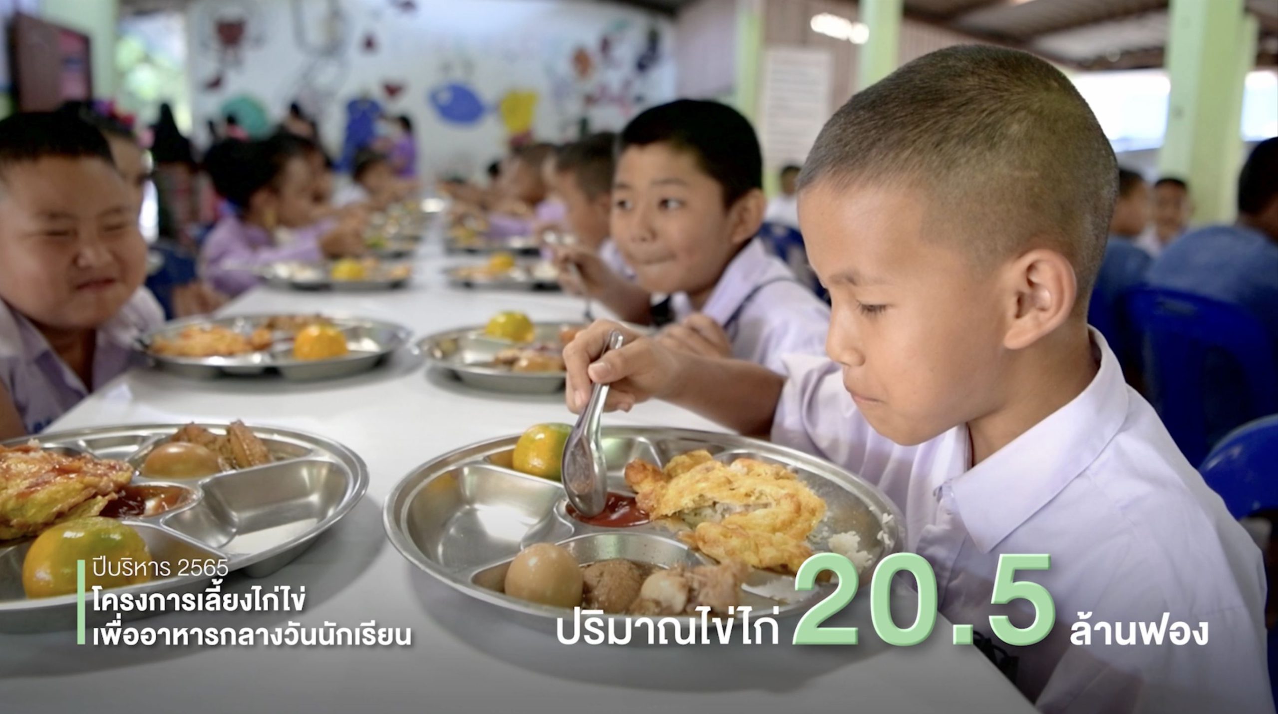 สร้างความมั่นคงทางอาหาร และการเข้าถึงโภชนาการที่ดี เหมาะสมกับแต่ละช่วงวัย โดยเฉพาะกับเด็กและเยาวชนในถิ่นทุรกันดารห่างไกล  โครงการเลี้ยงไก่ไข่เพื่ออาหารกลางวันนักเรียนสนับสนุนให้โรงเรียนผลิตไข่ไก่บรรเทาปัญหาขาดแคลนโปรตีน สารอาหารที่มีประโยชน์ต่อการเจริญเติบโต ทั้งร่างกายและสมองของเยาวชนในชนบทได้อย่างเป็นรูปธรรม ช่วยสนับสนุนความมั่นคงด้านอาหารและโภชนาการที่ดีแก่เด็กนักเรียนได้บริโภคอาหารที่มีโปรตีนอย่างเพียงพอและต่อเนื่องกว่า 180,000 คน สามารถผลิตไข่ไก่ที่มีคุณภาพ สด สะอาด ส่งมอบแก่นักเรียนและชุมชนกว่า 20.5 ล้านฟอง พร้อมบูรณาการกิจกรรมสู่การเรียนการสอนขยายผลไปแล้ว 935 โรงเรียน และยังพัฒนาสู่แหล่งเรียนรู้การจัดการอาชีพเกษตรเชิงธุรกิจให้กับครูและชุมชน