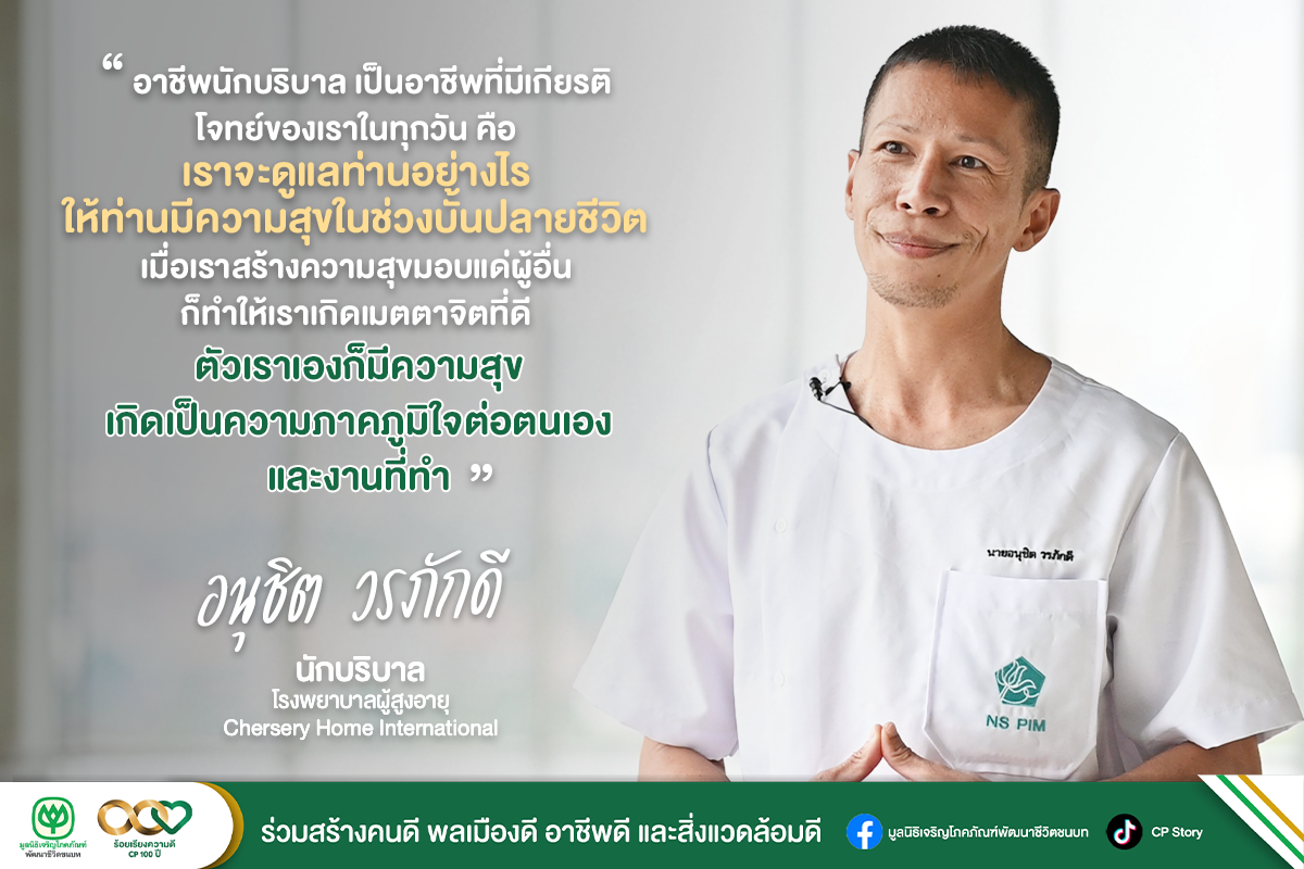 วันนี้เราจะมาทำความรู้จักกับอาชีพนักบริบาล ผ่านผู้สำเร็จการศึกษาหลักสูตรผู้ดูแลผู้สูงอายุ 420 ชั่วโมง จากสถาบันการจัดการปัญญาภิวัฒน์ (PIM) ภายใต้ โครงการพัฒนาอาชีพด้านการบริบาล “นายอนุชิต​ วร​ภักดี”​ หนึ่งในผู้รับทุนฝึกอบรม ซึ่งปัจจุบันประกอบอาชีพเป็นพนักงานของโรงพยาบาลผู้สูงอายุ Chersery Home International ทำหน้าที่เป็นนักบริบาลดูแลผู้สูงอายุประจำบ้านผู้ป่วย โดยก่อนหน้าที่จะเข้ามาทำงานด้านนี้ นายอนุชิต​ วร​ภักดี ​มีมุมมองต่อผู้สูงอายุว่าเป็น “บุคคลที่ควรค่าแก่การดูแลเอาใจใส่ เพราะผู้สูงอายุเป็นบุคลากรที่เคยสร้างคุณค่าและประโยชน์ทั้งทางตรงและทางอ้อมแก่ครอบครัวและสังคม และเมื่อก้าวเข้าสู่วัยชรา ท่านก็ควรได้รับการปรนนิบัติดูแลอย่างเหมาะสม จึงทำให้ตนสนใจที่จะเข้ามาทำอาชีพนี้”