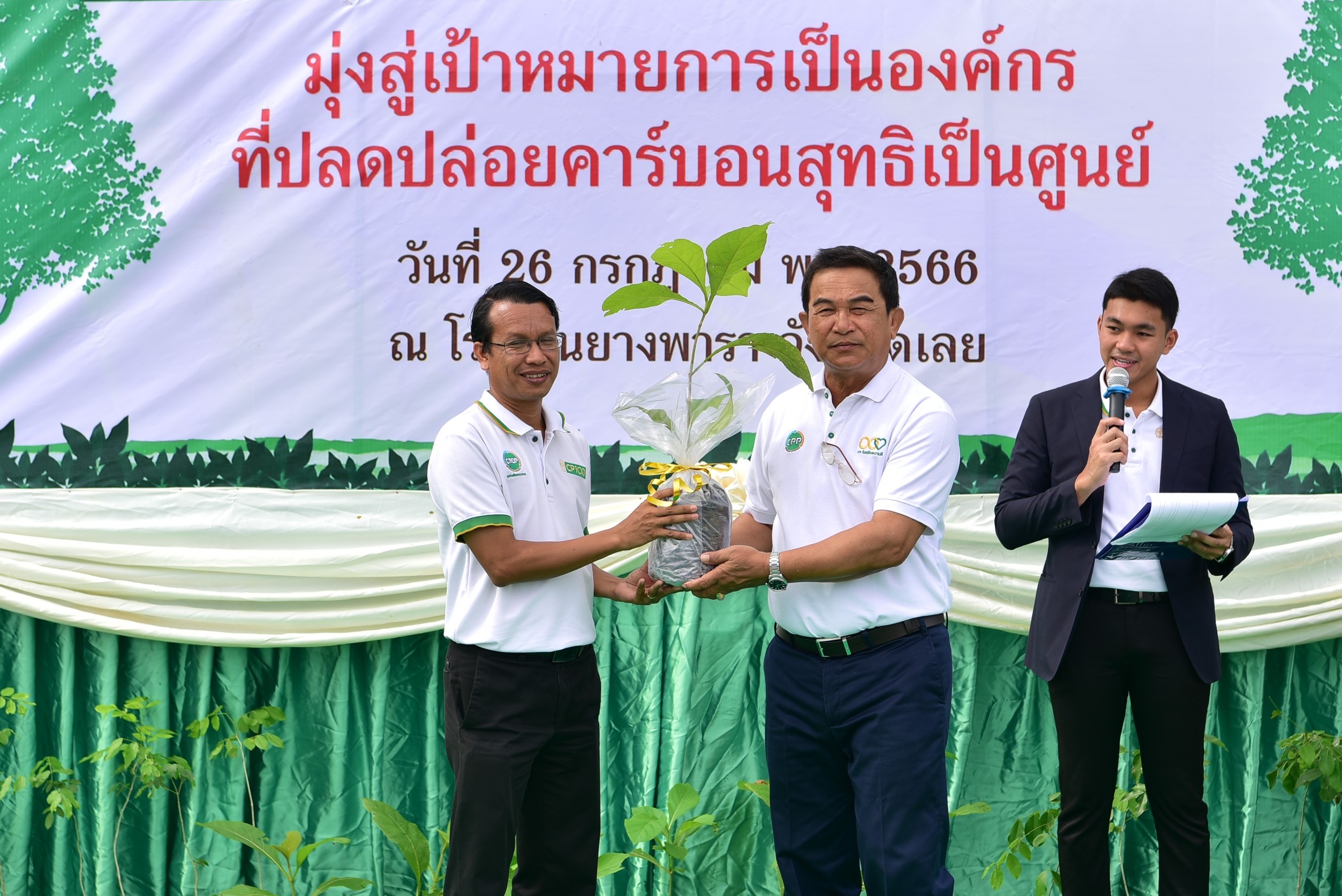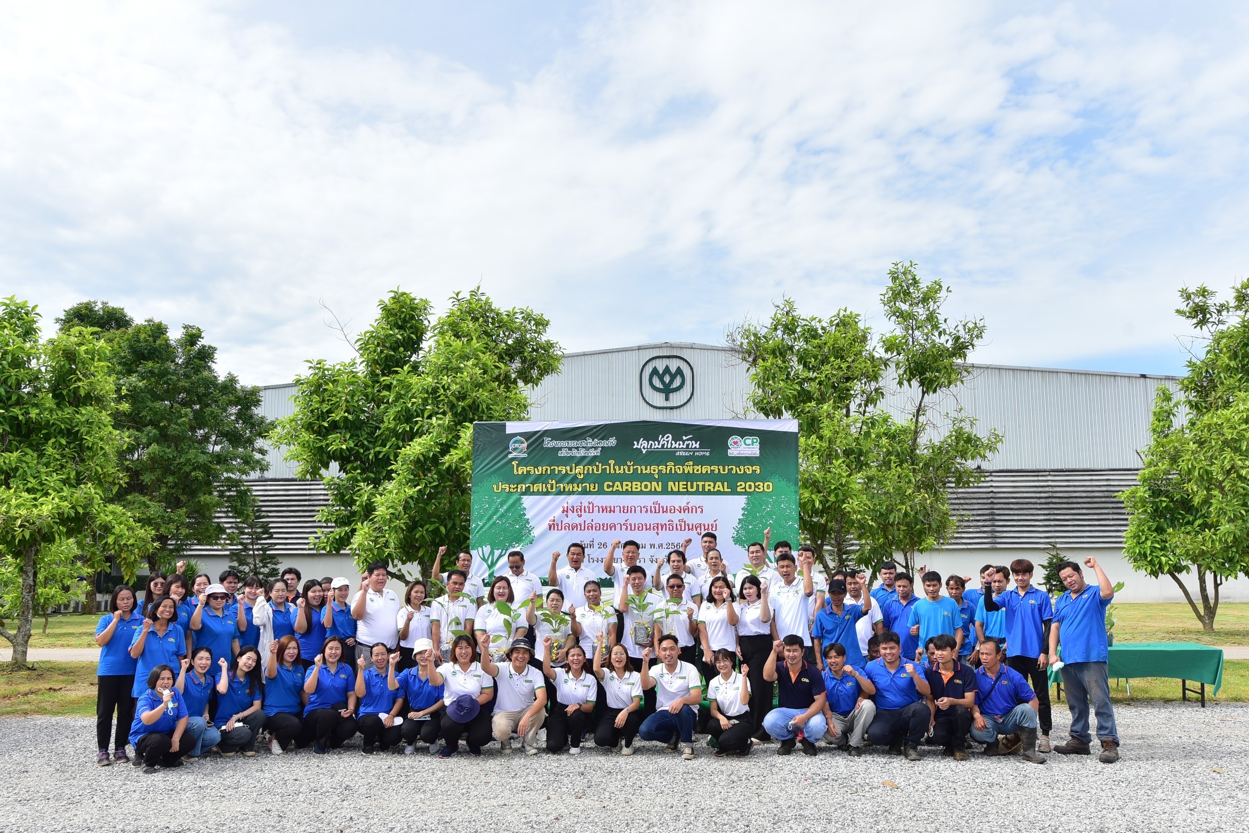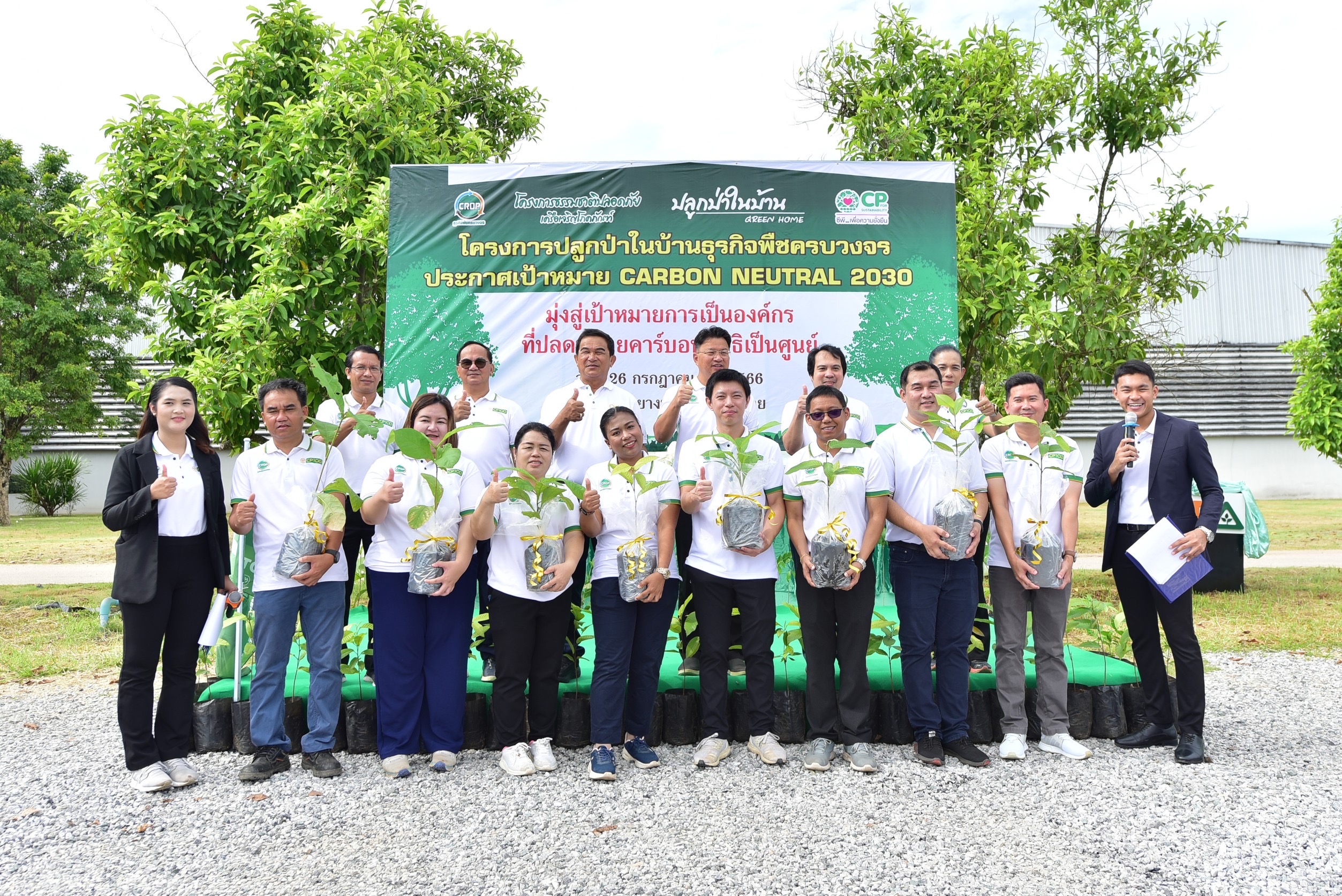 คุณสายัณห์ หงษา ประธานคณะผู้บริหารฝ่ายปฏิบัติการ ด้านบริหารงานขายและต่างประเทศ ธุรกิจพืชครบวงจร ข้าว ขนส่งและบริการ เครือเจริญโภคภัณฑ์ เปิดเผยภายหลังร่วมกิจกรรมปลูกไม้ยืนต้นในโครงการปลูกป่าในบ้าน ณ โรงงานยางพารา อ.วังสะพุง จ.เลย ว่า ตามที่เครือซี.พี. ตั้งเป้าหมายเป็นองค์กรที่เป็นกลางทางคาร์บอน (Carbon Neutral) ภายในปี 2573 และมุ่งสู่การปล่อยก๊าซเรือนกระจกสุทธิเป็นศูนย์ (Net Zero) ภายในปี 2593 โดยการรณรงค์ผ่าน “โครงการซีพี ร้อยรักษ์โลก” ให้ทุกหน่วยธุรกิจ ปลูกไม้ยืนต้นในพื้นที่ของหน่วยงาน และร่วมกับภาคีเครือข่ายในพื้นที่ต่างๆ ปลูกไม้ยืนต้นในพื้นที่สาธารณะ รวมทั้งสิ้น 20 ล้านต้น เพื่อเพิ่มพื้นที่สีเขียวในการดูดซับก๊าซเรือนกระจก