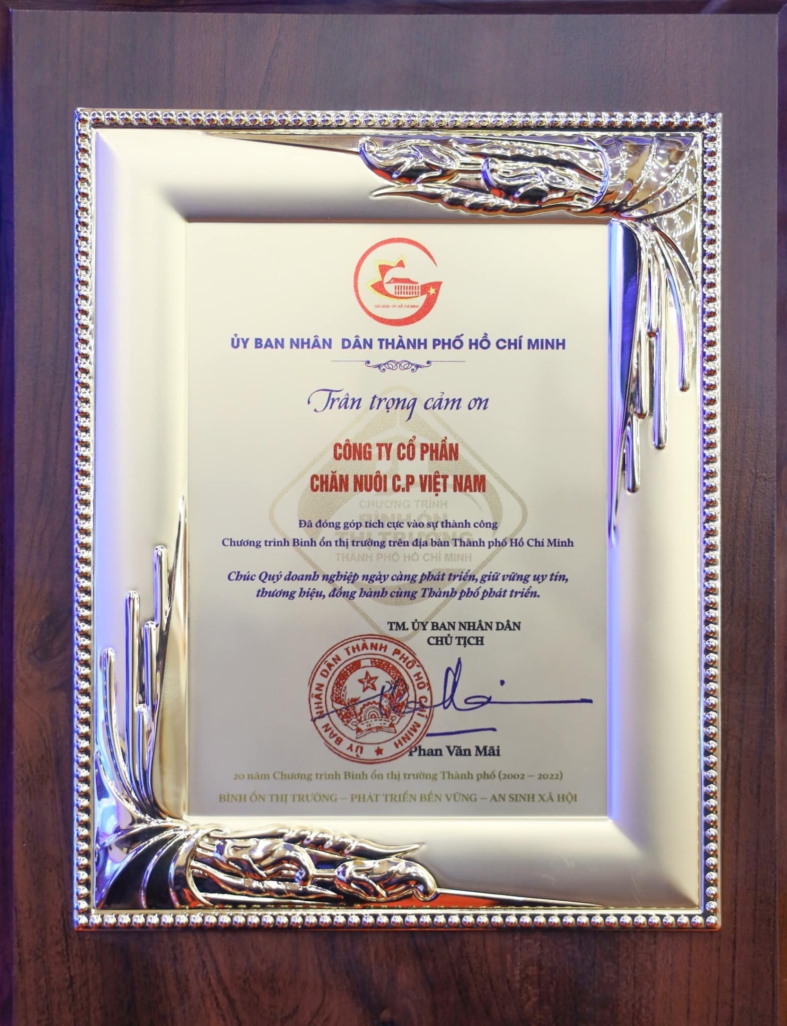 ด้าน นาย Phan Van Mai ประธานคณะกรรมการประชาชนนครโฮจิมินห์ มอบใบเกียรติบัตรให้แก่ CP เวียดนาม รวมทั้งภาคธุรกิจ 14 องค์กร จาก 55 องค์กร สะท้อนการเป็นธุรกิจที่มีส่วนร่วมรักษาความเสถียรภาพตลาดในเขตนครโฮจิมินห์ ในช่วงปี 2002 – 2022 ได้อย่างมีประสิทธิภาพ โดยมี คุณมนตรี สุวรรณโพธิ์ศรี กรรมการผู้จัดการ และคณะผู้บริหารระดับสูง CP เวียดนาม ร่วมรับมอบ