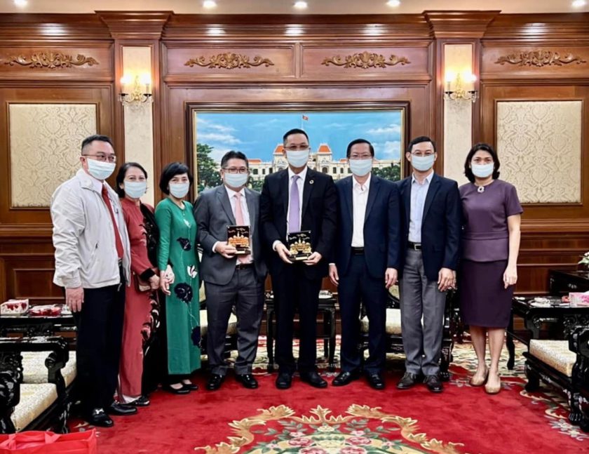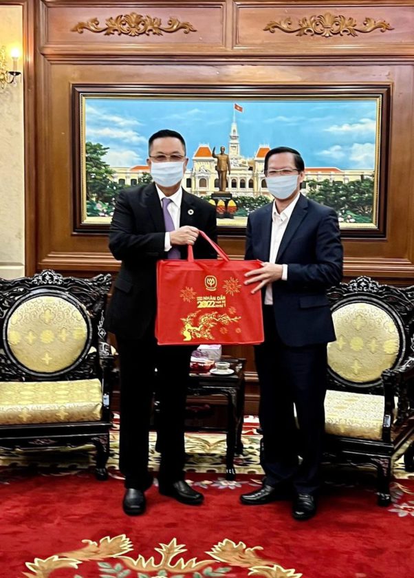 คุณฟาน วัน หมาย สมาชิกคณะกรรมการบริหารพรรคคอมมิวนิสต์ส่วนกลาง และประธานคณะกรรมการประชาชนนครโฮจิมินห์ ให้การต้อนรับ คุณสุขสันต์ เจียมใจสว่างฤกษ์ รองประธานคณะกรรมการบริหาร CPF พร้อมด้วย คุณมนตรี สุวรรณโพธิ์ศรี กรรมการผู้จัดการ CP เวียดนาม, คุณอดิศักดิ์ ต่อสกุล รองกรรมการผู้จัดการบริหาร และ คุณ Le Nhat Thuy ประธานกองทุน ซี.พี.เวียดนามเพื่อการกุศล ที่เข้าเยี่ยมคารวะในโอกาสเทศกาลตรุษเวียดนามและแสดงความยินดีที่ได้ดำรงตำแหน่งประธานคณะกรรมการประชาชนนครโฮจิมินห์ พร้อมรายงานการดำเนินธุรกิจและกิจกรรมเพื่อช่วยเหลือสังคมของ ซี.พี. เวียดนาม ในช่วงโควิด-19 โดยมี คุณจั่น เฟื๊อก อัน ผู้อำนวยการกรมสัมพันธ์ต่างประเทศ และ คุณ เล ถิ ฮิ่น มาย ผู้อำนวยการกรมวางแผนและการลงทุน นครโฮจิมินห์ ร่วมต้อนรับ