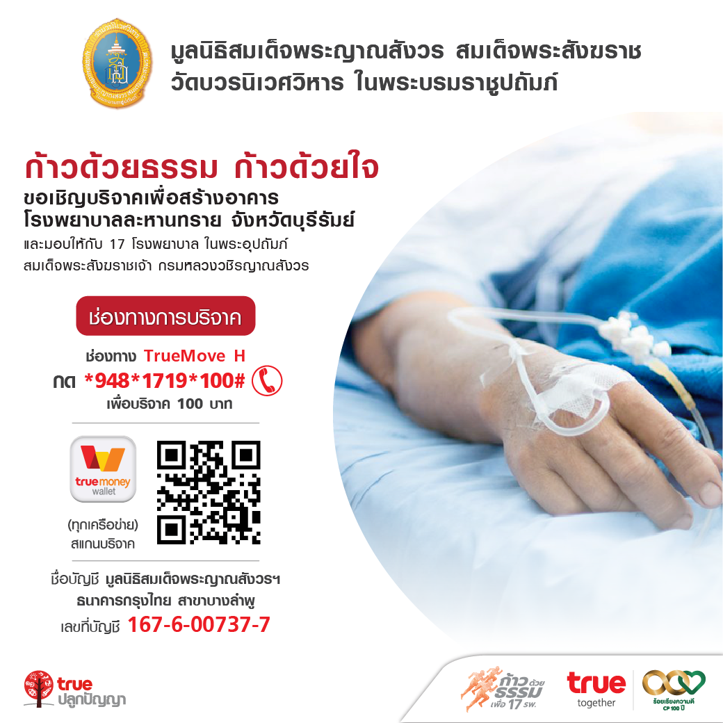 ขอเชิญร่วมบริจาคเพื่อสร้างอาคารโรงพยาบาลละหานทราย จ.บุรีรัมย์ และมอบให้กับ 17 โรงพยาบาล ในพระอุปถัมภ์สมเด็จพระสังฆราชเจ้า กรมหลวงวชิรญาณสังวร เพื่อประโยชน์ทางการแพทย์ รักษาเยียวยากรณีเร่งด่วน ให้แก่ประชาชนในพื้นที่ห่างไกล และคนไข้ยากจน ที่รอคอยการเยียวยารักษา
