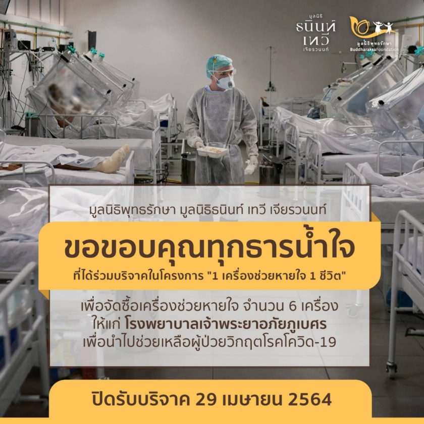 “1 เครื่องช่วยหายใจ 1 ชีวิต” มูลนิธิพุทธรักษา มูลนิธิธนินท์ เทวี เจียรวนนท์ ขอขอบคุณผู้มีจิตศรัทธาทุกท่านที่ได้ร่วมบริจาคเงินเพื่อจัดซื้อเครื่องช่วยหายใจภายในสองวันมากถึงสี่ล้านหกแสนสองหมื่นบาท