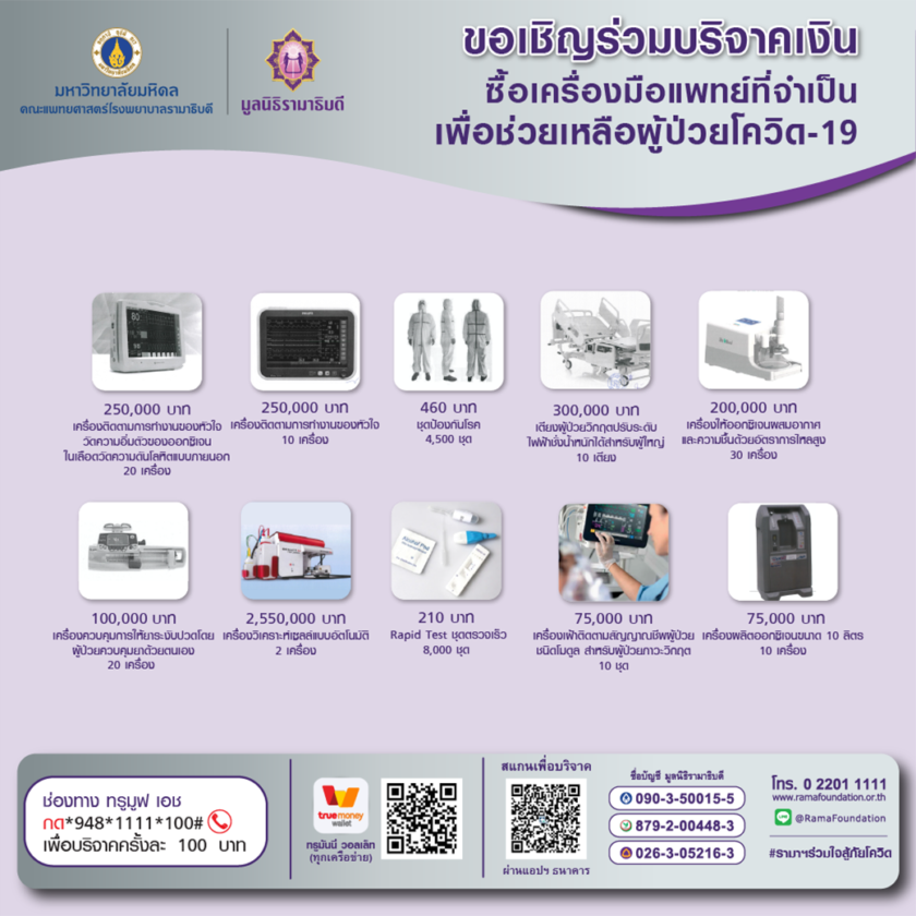 มูลนิธิรามาธิบดีฯ ขอเชิญร่วมบริจาคเงินสมทบทุนซื้อเครื่องมือแพทย์ที่จำเป็นสำหรับรักษาผู้ป่วยโควิด – 19 เพื่อเพิ่มโอกาสการรอดชีวิตให้แก่ผู้ป่วยอีกจำนวนมาก