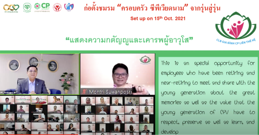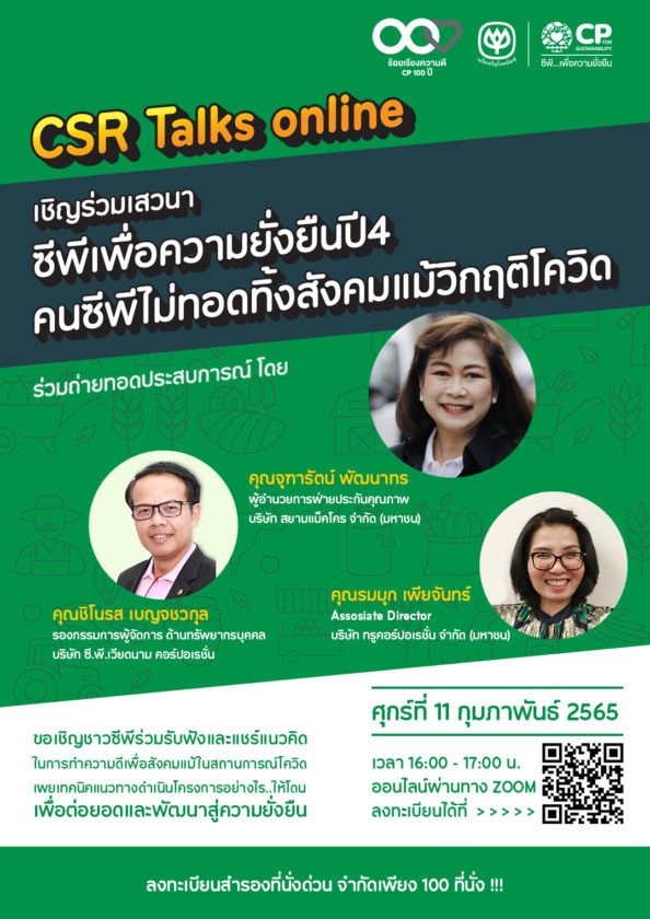 เมื่อเร็ว ๆ นี้ สำนักบริหารความยั่งยืน ธรรมาภิบาล และสื่อสารองค์กร เครือเจริญโภคภัณฑ์ จัดกิจกรรมเสวนาออนไลน์ ชวนชาวซีพีร่วมรับฟังและแชร์แนวคิดในการทำความดีเพื่อสังคม แม้ในช่วงที่ประเทศไทยเผชิญกับสถานการณ์การแพร่ระบาดของโรคโควิด-19 โดยมีตัวแทนผู้บริหารเครือฯ คุณชิโนรส เบญจชวกุล รองกรรมการผู้จัดการ ด้านทรัพยากรบุคคล บริษัท ซี.พี. เวียดนาม คอร์ปอเรชั่น คุณจุฑารัตน์ พัฒนาทร ผู้อำนวยการฝ่ายประกันคุณภาพ บริษัท สยามแม็คโคร จำกัด (มหาชน) และ คุณรมมุก เพียจันทร์ Associate Director บริษัท ทรูคอร์ปอเรชั่นจำกัด (มหาชน) ให้เกียรติมาร่วมแลกเปลี่ยนเรียนรู้และประสบการณ์ในการทำกิจกรรมเพื่อสังคมในช่วงวิกฤตที่ผ่านมา