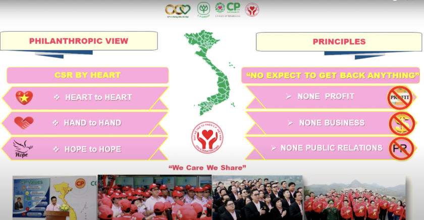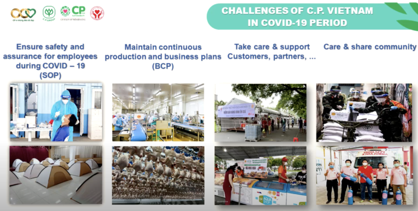 คุณชิโนรส เบญจชวกุล รองกรรมการผู้จัดการ ด้านทรัพยากรบุคคล บริษัท ซี.พี. เวียดนาม คอร์ปอเรชั่น กล่าวว่า สถานการณ์การแพร่ระบาดของโควิด-19 ที่ประเทศเวียดนามในช่วงสองปีที่ผ่านมา ส่งผลกระทบต่อภาคอุตสาหกรรมที่ต้องหยุดชะงัก การเดินทางข้ามประเทศถูกสั่งปิดโดยส่งผลต่อเนื่องกับธุรกิจโลจิสติกส์ การผลิต และการสาธารณสุข อย่างไรก็ตาม แม้ว่าจะเกิดสถานการณ์โควิด-19 ในประเทศเวียดนาม บริษัทฯ ก็ยังคงดำเนินกิจกรรมเพื่อสังคมอย่างต่อเนื่อง