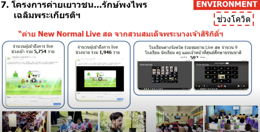 นอกจากนี้ ยังมีกิจกรรมด้านสิ่งแวดล้อม ด้วยการจัดค่ายเยาวชน รักษ์พงไพร เฉลิมพระเกียรติฯ แบบ New Normal ให้ครู นักเรียน และ เจ้าหน้าที่ศึกษาธรรมชาติได้ร่วมชมและเรียนรู้การอนุรักษ์สิ่งแวดล้อมผ่านการ Live สด ซึ่งโครงการต่าง ๆ เหล่านี้เป็นสิ่งที่แสดงให้เห็นถึงศักยภาพของกลุ่มทรูที่ได้ใช้เทคโนโลยีให้เกิดประโยชน์สูงสุดต่อสังคมในทุก ๆ ด้าน