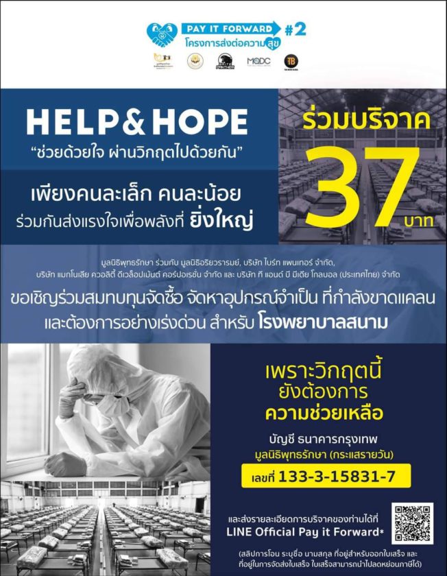เพราะวิกฤตโควิด 19 นี้ ยังต้องการความช่วยเหลืออย่างเร่งด่วน!!! ขอเชิญร่วมบริจาคในโครงการ Pay It Forward #2 – Help & Hope “ช่วยด้วยใจ ผ่านวิกฤตไปด้วยกัน” น้ำใจของคุณ สามารถช่วยบรรเทาวิกฤตนี้ได้ด้