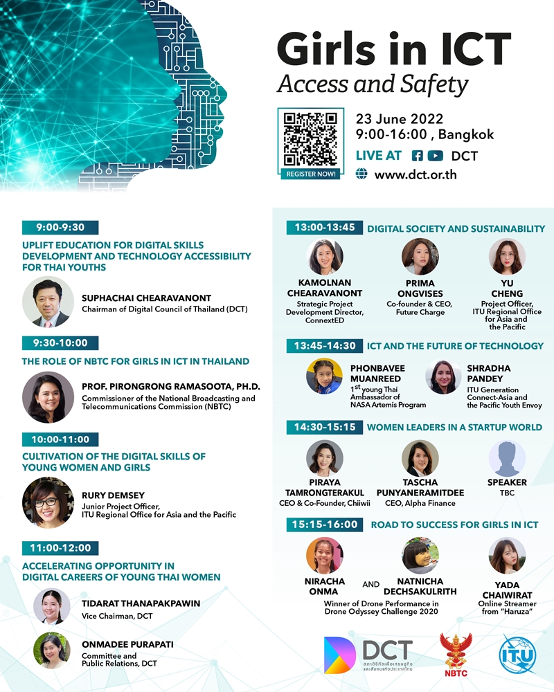 สภาดิจิทัลเพื่อเศรษฐกิจและสังคมแห่งประเทศไทย ร่วมกับสำนักงานพัฒนาโทรคมนาคมของสหภาพโทรคมนาคมระหว่างประเทศ (ITU) ซึ่งเป็นองค์การชำนัญพิเศษของสหประชาชาติ และสำนักงานคณะกรรมการกิจการกระจายเสียง กิจการโทรทัศน์ และกิจการโทรคมนาคมแห่งชาติ (กสทช.) ขอเชิญร่วมงานระดับโลก “Girls in ICT Access and Safety” ในวันที่ 23 มิถุนายน 2565 (9.00-16.00 น.) ผ่าน Zoom Webinar โดยมีจุดมุ่งหมายเพื่อสนับสนุนวาระของโลกในการสร้างแรงบันดาลใจให้เด็กผู้หญิงและเยาวชนหญิงให้มีทัศนคติ ศักยภาพ และความเชื่อ ในการพัฒนาทักษะด้านวิทยาศาสตร์ เทคโนโลยี วิศวกรรมศาสตร์ และคณิตศาสตร์
