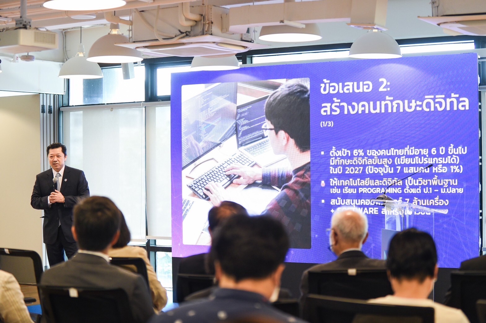 - สร้างคนทักษะดิจิทัลโดยการปฏิรูปการศึกษา ตั้งเป้า 6% ของคนไทยอายุ 6 ปีขึ้นไปมีทักษะดิจิทัลขั้นสูง ภายในปี 2570 แม้ประเทศไทยมีการพัฒนาอย่างก้าวกระโดดแต่ในปัจจุบันคนไทยที่มีทักษะดิจิทัลขั้นสูง (เขียนโปรแกรมได้) ยังมีเพียง 7 แสนคนหรือ 1% ในขณะที่มาเลเซียมีมากถึง 16% ซึ่งระดับทักษะดิจิทัลของคนในประเทศย่อมส่งผลกระทบทั้งด้านการพัฒนาอุตสาหกรรมต่าง ๆ การวิจัยพัฒนานวัตกรรม การวางแผนการพัฒนาบุคคลากรและการดึงดูดการลงทุนการแก้ไขปัญหาถือเป็นเรื่องเร่งด่วนโดยควรปฏิรูปการศึกษา (Education Reform) เริ่มจากการวางวิชาพื้นฐานในระดับเยาวชนด้วยหลักสูตรด้านเทคโนโลยีในการศึกษาภาคบังคับ การเรียนภาษาคอมพิวเตอร์ และ Computer Science เป็นวิชาหลัก รวมทั้งผลักดันให้เยาวชนไทย 7 ล้านคนมีคอมพิวเตอร์ที่มีการคัดกรองเนื้อหาที่ดี เพื่อให้เข้าถึงการค้นคว้า วิจัย พัฒนานวัตกรรม รวมทั้งปลูกฝังคุณธรรมในการใช้เทคโนโลยี นอกจากนั้นยังควรปลูกฝังความเป็นผู้ประกอบการตั้งแต่ระดับนักเรียน นักศึกษา รวมทั้ง ส่งเสริมทักษะด้านภาษาอังกฤษและภาษาจีนก่อนเข้าสู่โลกธุรกิจจริงในอนาคต ระดับโรงเรียนต้องสร้างแหล่งเรียนรู้เชิงประสบการณ์ (Experience Learning Based Center) ระดับมหาวิทยาลัยต้องมีศูนย์ความเป็นเลิศด้านนวัตกรรม (Excellence Center) และในระดับเมืองควรเป็นคลัสเตอร์แห่งเทคโนโลยีและนวัตกรรม (Innovation Cluster) สิ่งเหล่านี้ล้วนเป็นรากฐานสำคัญให้เกิดการพัฒนาทักษะดิจิทัลในทุกระดับ