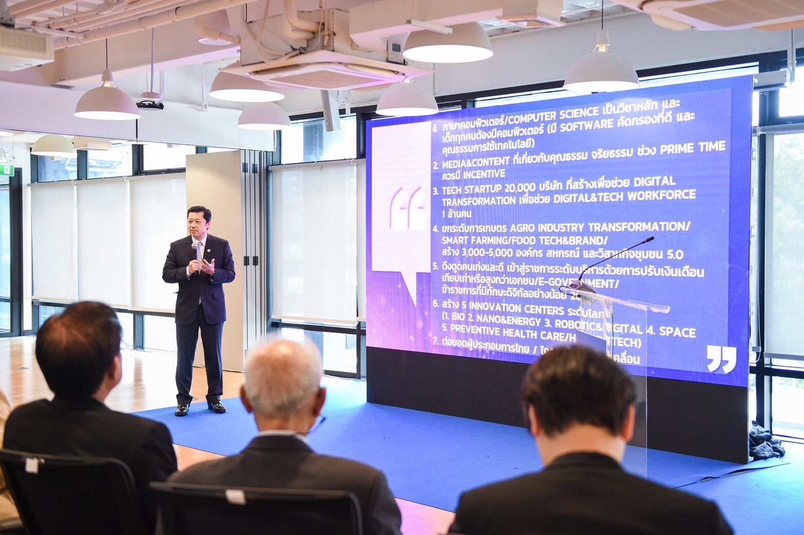 - ตั้งเป้าให้ไทยเป็นศูนย์กลางนวัตกรรมแห่งภูมิภาคอาเซียนภายในปี 2568 ยกระดับ R&D สร้างเทคสตาร์ทอัพ 20,000 บริษัทในไทยเพื่อช่วยเร่งให้เกิดการทำ Digital Transformation ได้เร็วขึ้น และทำให้เกิดการจ้างงาน Digital & Tech Workforce ไม่ต่ำกว่า 1,000,000 คน ประเทศไทยมีโอกาสดึงดูดนักลงทุนระดับโลกด้วยความพร้อมทางภูมิศาสตร์และความเข้มแข็งของอุตสาหกรรมที่ประเทศไทยมีอยู่ เทคสตาร์ทอัพนับเป็นหัวใจในการขับเคลื่อนธุรกิจด้านเทคโนโลยี นวัตกรรม และช่วยกระตุ้นเศรษฐกิจ รวมถึงการจ้างงาน อีกทั้ง จำนวนสตาร์ทอัพยังเป็นเสมือนกระจกสะท้อนความสามารถการแข่งขันด้านดิจิทัล ซึ่งส่งผลโดยตรงต่อความมั่นใจในการตัดสินใจลงทุน รัฐจึงควรตั้งเป้าหมายดึงดูดกองทุนหรือนักลงทุนระดับโลก (Big Boy) อย่างน้อย 3 ราย ยิ่งไปกว่านั้นประเทศไทยควรสร้าง 5 Innovation Center ระดับโลก ได้แก่ 1.Bio 2.Nano & Energy 3. Robotic & Digital 4. Space 5. Preventive Health care / Health Tech อย่างไรก็ตามการตั้งเป้าเป็น Regional Innovation Hub หรือแหล่งการลงทุนและศูนย์สร้างสรรค์นวัตกรรมของภูมิภาค เราจะต้องพัฒนาศักยภาพการเป็น Innovation Cluster สำหรับผู้ประกอบการและนักวิจัยไทย ตลอดจน ผลักดันนโยบายเร่งด่วนเพื่อดึงดูดการลงทุน และผู้เชี่ยวชาญระดับโลก เช่น Global Talents และDigital Nomads พร้อมทั้งเร่งยกระดับงานวิจัยและนวัตกรรมโดยประสานพลังภาครัฐ ภาคเอกชน และสถาบันการศึกษาให้ต่อยอดขยายผลเกิดการใช้งานจริงได้ในระดับโลก