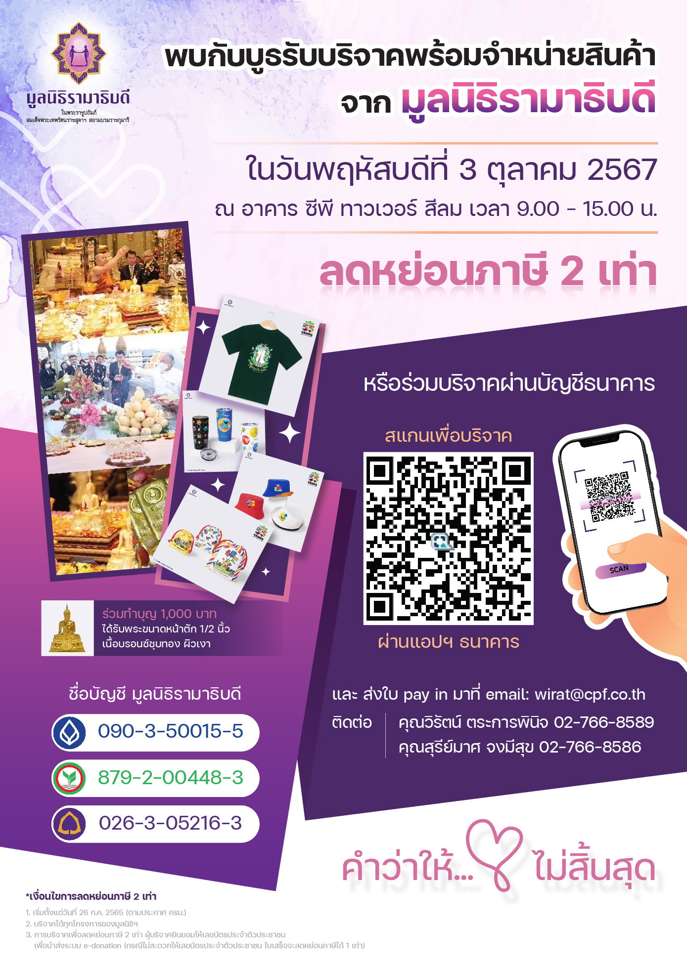 🛎พบกับบูธรับบริจาคพร้อมจำหน่ายสินค้าจาก มูลนิธิรามาธิบดี ในวันพฤหัสบดีที่ 3 ตุลาคม 2567 ณ อาคาร ซีพี ทาวเวอร์ สีลม เวลา 9.00 – 15.00 น. โดยสามารถนำไปลดหย่อนภาษีได้ถึง 2 เท่า พร้อมความพิเศษ เมื่อร่วมทำบุญ 1,000 บาท ได้รับพระขนาดหน้าตัก 1/2 นิ้ว เนื้อบรอนซ์ชุบทอง ผิวเงา