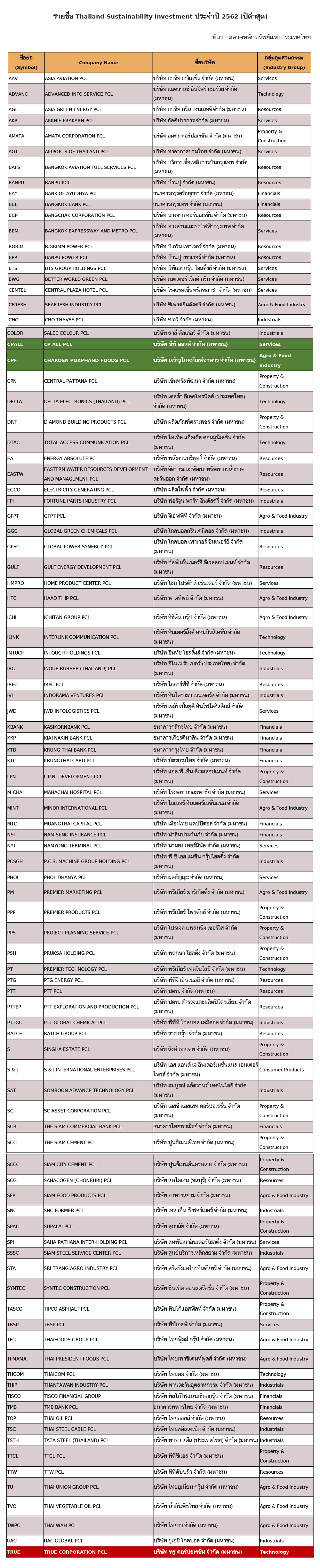 ทั้งนี้ บริษัท เจริญโภคภัณฑ์ อาหาร จำกัด (มหาชน) หรือ ซีพีเอฟ บริษัท ซีพี ออล์ จำกัด (มหาชน) และบริษัท ทรู คอร์ปอเรชั่น จำกัด(มหาชน) ได้รับการคัดเลือกจากตลาดหลักทรัพย์ให้เป็น “หุ้นยั่งยืน” หรือ Thailand Sustainability Investment ประจำปี 2562 สะท้อนให้เห็นความมุ่งมั่นและการให้ความสำคัญและมีพัฒนาการในการดำเนินธุรกิจสู่การพัฒนาอย่างยั่งยืน โดยคำนึงถึงความสมดุลของด้านเศรษฐกิจ สังคม และสิ่งแวดล้อม สังคม และธรรมาภิบาล