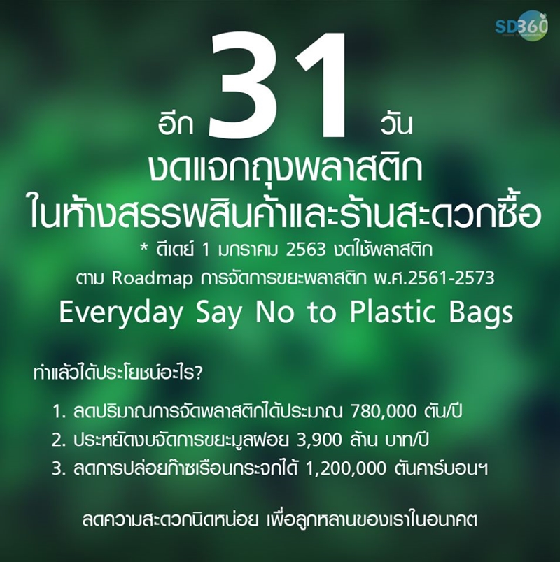 สมาคมผู้ค้าปลีกคาดว่าจะสามารถลดปริมาณการใช้ถุงพลาสติกหูหิ้วได้มากถึง 9,000 ล้านใบต่อปี หรือคิดเป็นร้อยละ 20 ของขยะถุงพลาสติกทั้งหมด พร้อมสนับสนุน แคมเปญ “Everyday Say No to Plastic Bags” งดให้ถุงพลาสติกหูหิ้วตั้งแต่วันที่ 1 มกราคม 2563 ซึ่งมีค้าปลีกเข้าร่วมโครงการกว่า 75 ร้านค้า ที่มีช่องทางจำหน่ายกว่า 24,500 ช่องทาง ยืนยันงดให้ถุงพลาสติกหูหิ้ว ซึ่งคาดว่าจะบรรลุเป้าหมายและสามารถสร้างพฤติกรรมและทัศนคติต่อผู้บริโภคในการร่วม ลด ละ เลิก ขยะพลาสติก ได้เร็วกว่าโรดแมปที่กระทรวงทรัพยากรธรรมชาติและสิ่งแวดล้อมกำหนดว่าถุงพลาสติกจะหมดไปปี2571