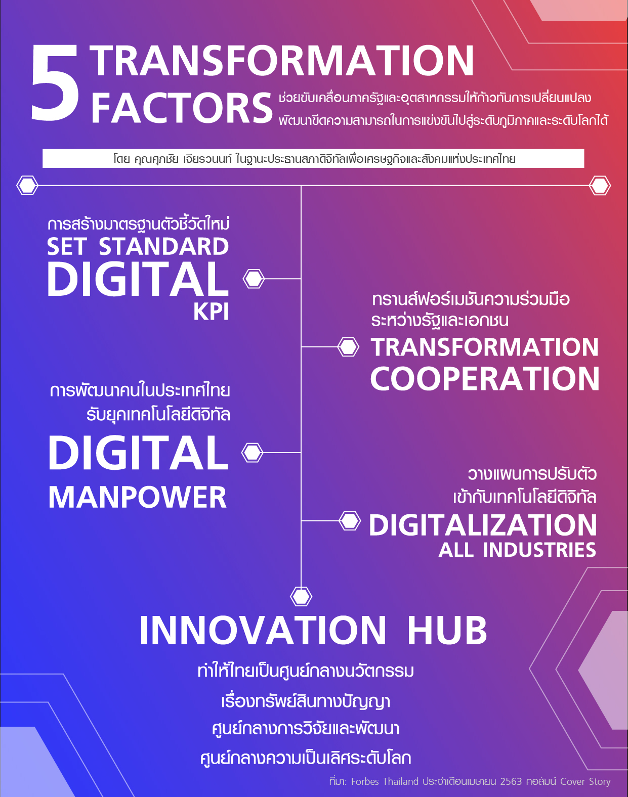 เช่นเดียวกับ คุณศุภชัย เจียรวนนท์ CEO เครือฯ ในฐานะประธานสภาดิจิทัลเพื่อเศรษฐกิจและสังคมแห่งประเทศไทยเผยถึง 5 ปัจจัยสำคัญ ที่จะทรานส์ฟอร์ประเทศ ช่วยขับเคลื่อนภาครัฐและอุตสาหกรรมให้ก้าวทันการเปลี่ยนแปลง พัฒนาขีดความสามารถในการแข่งขันไปสู่ระดับภูมิภาคและระดับโลกได้