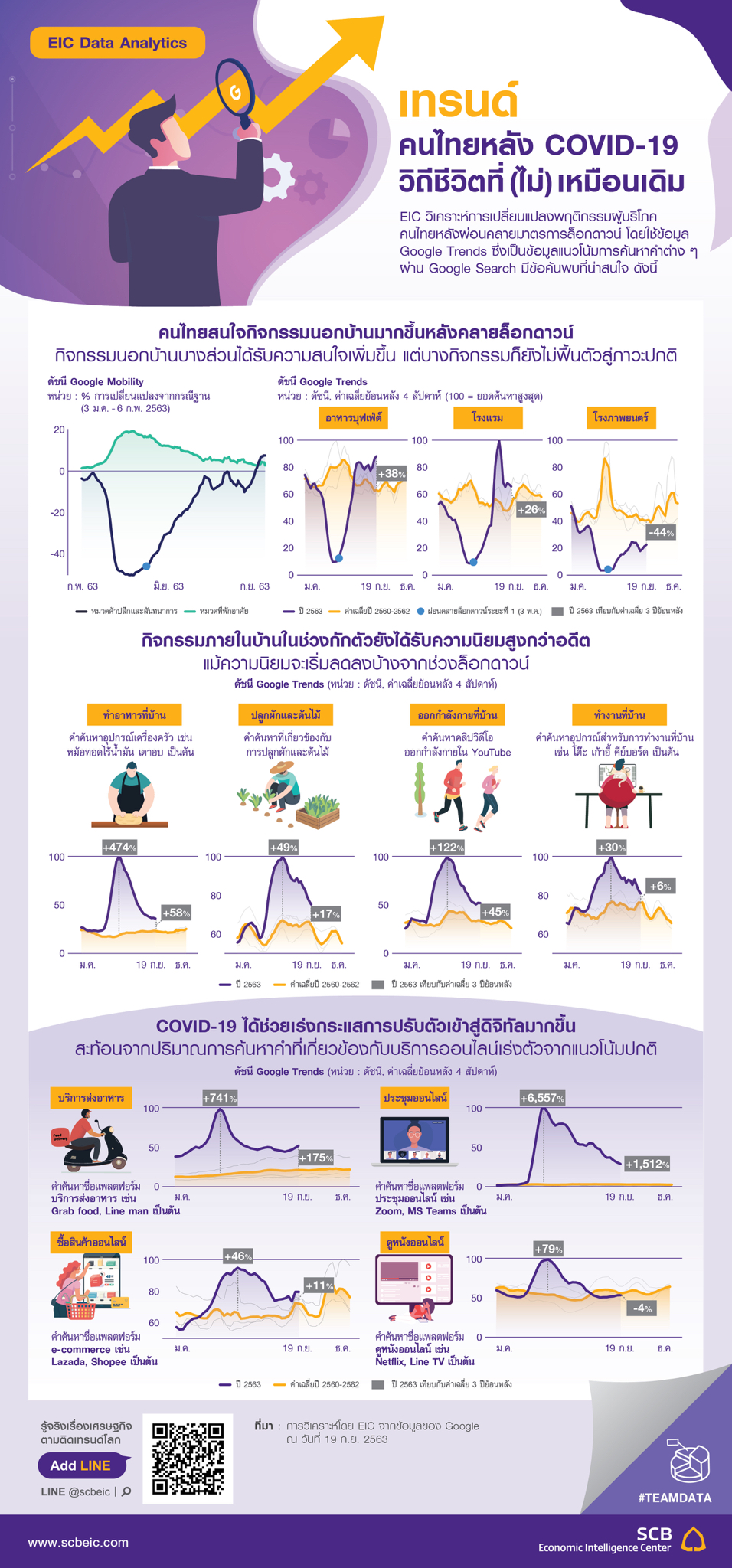 EIC ธนาคารไทยพาณิชย์ได้วิเคราะห์การเปลี่ยนแปลงพฤติกรรมผู้บริโภคคนไทยหลังผ่อนคลายมาตรการล็อกดาวน์ โดยใช้ข้อมูล Google Trends ซึ่งเป็นข้อมูลแนวโน้มการค้นหาคำต่าง ๆ ผ่าน Google Search พบว่า พฤติกรรมยอดฮิตของผู้บริโภคหลายประเภทในช่วงล็อกดาวน์ยังคงได้รับความนิยมสูงกว่าค่าเฉลี่ยในอดีต โดยเฉพาะพฤติกรรมการใช้แพลตฟอร์มออนไลน์ต่าง ๆ ที่มีแนวโน้มเป็นพฤติกรรม New normal ของคนไทย เช่น food delivery, e-commerce และการประชุมออนไลน์ เป็นต้น