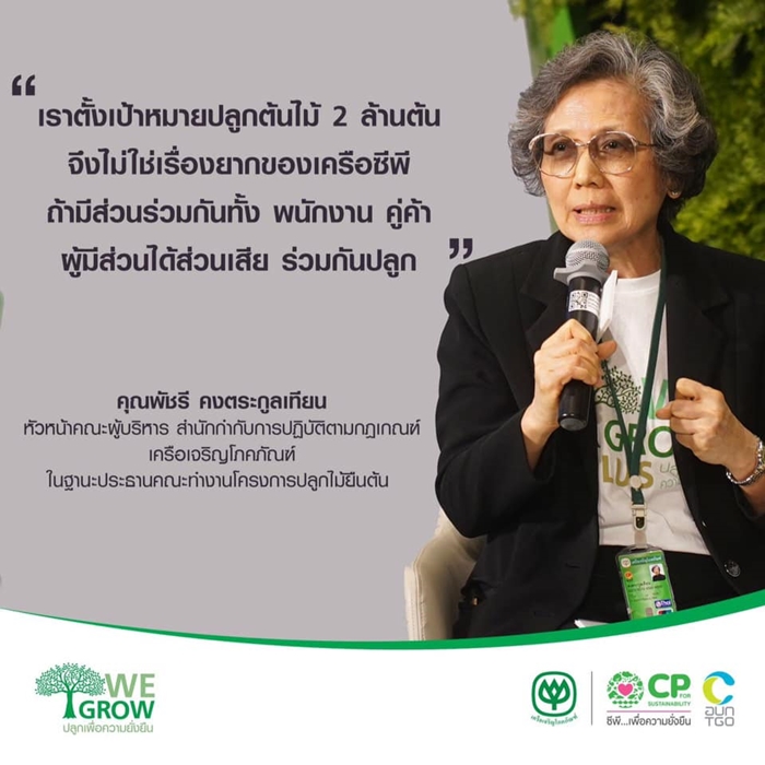 หน่วยงานซีพีช่วยกันจัดประกวดการปลูกต้นไม้ ให้ความรู้เรื่องของต้นไม้ หรือรวมตัวกันหาพื้นที่ปลูกต้นไม้ร่วมกับวัด ชุมชน ถ้าเราช่วยกันปลูก ส่งเสริมการปลูกต้นไม้กัน ไม่เพียงเราได้ต้นไม้คืนมา ยังช่วยให้เครือฯบรรลุเป้าหมายการปลูกต้นไม้ เรายังได้เครื่องกรองฝุ่น เครื่องกรองอากาศดีๆกลับคืนมา