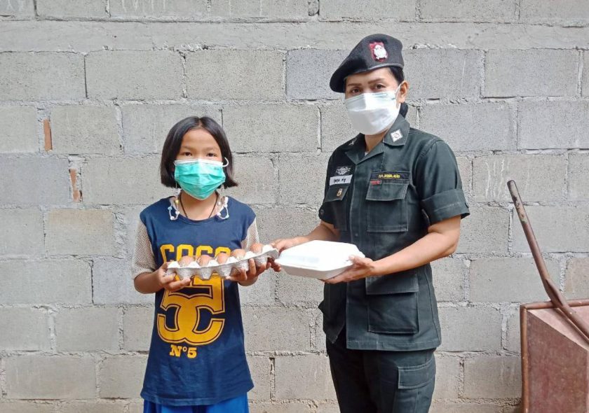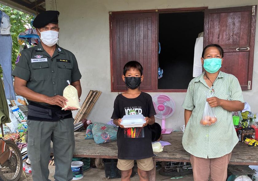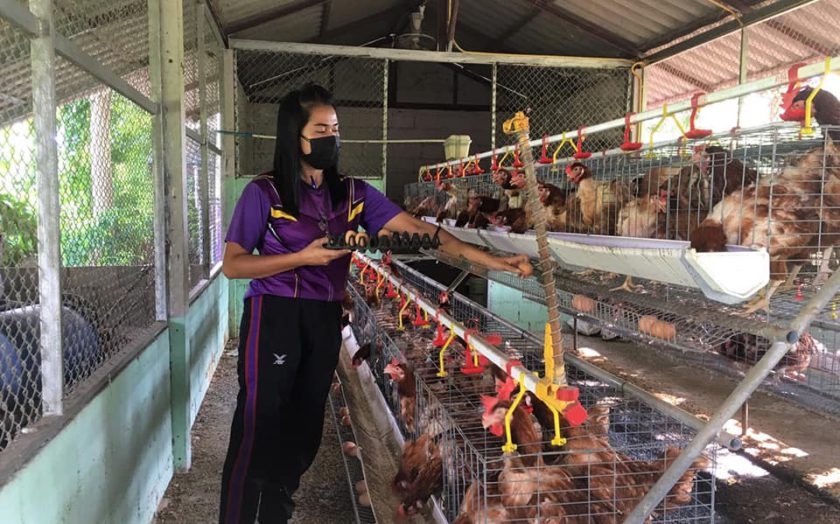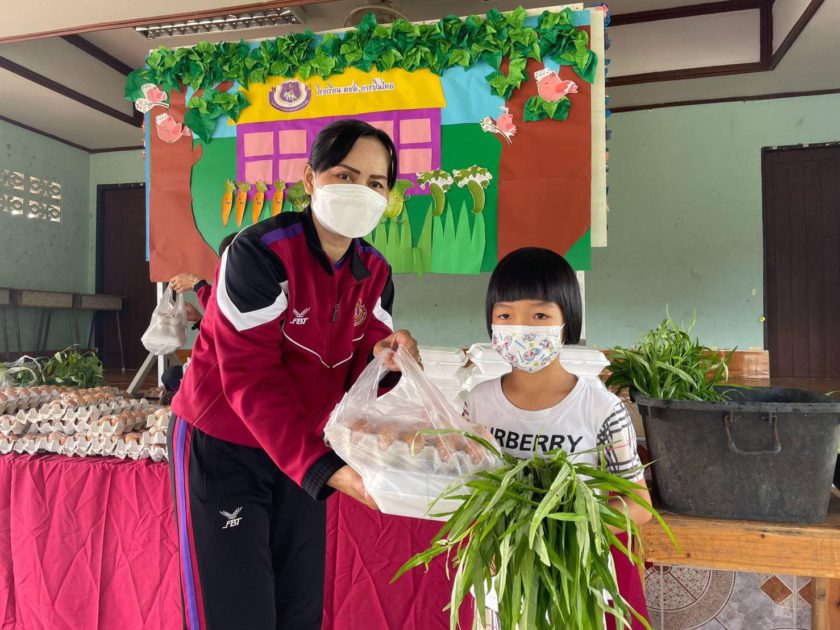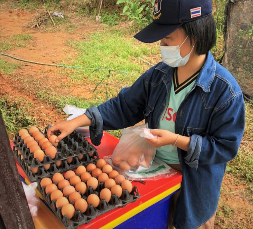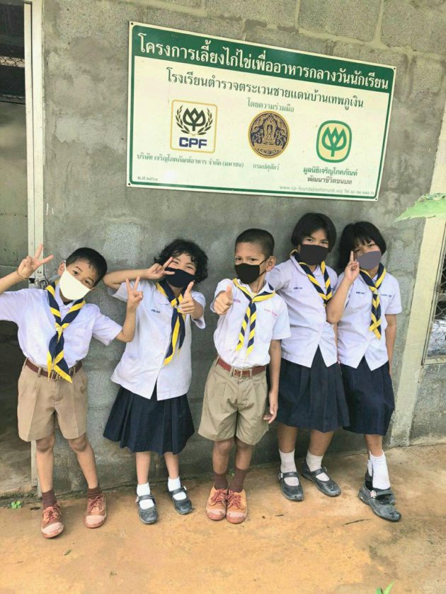 ที่โรงเรียน ตชด.การบินไทย ต.ไทรเดี่ยว อ.คลองหาด จ.สระแก้ว ซึ่งปีนี้ร่วมโครงกาฯมาเป็นปีที่ 18 แล้ว ด.ต.หญิงรุ่งอรุน ค่ำชู ครูผู้ดูแลโครงการเลี้ยงไก่ไข่เพื่ออาหารกลางวันนักเรียน เล่าว่า โรงเรียนเปิดสอนตั้งแต่ชั้นอนุบาล-ประถมศึกษาปีที่ 6 มีเด็กนักเรียน 140 คน ในพื้นที่บริการ 3 หมู่บ้าน เด็กๆส่วนใหญ่อาศัยอยู่กับปู่ย่าตายาย ที่ทำอาชีพทำนา ทำไร่ และรับจ้าง เพราะพ่อแม่ต้องไปทำงานต่างจังหวัด โรงเรียนเลี้ยงไก่ไข่ 150 ตัว จากการสนับสนุนของซีพีเอฟ หรือ บริษัท เจริญโภคภัณฑ์อาหาร จำกัด (มหาชน) และมูลนิธิเจริญโภคภัณฑ์พัฒนาชีวิตชนบท ให้พันธุ์ไก่ อาหารสัตว์ พร้อมโรงเรือนแบบให้เปล่าในรุ่นแรก เมื่อปี 2546 ทำให้โรงเรียนสามารถบริหารจัดการได้อย่างต่อเนื่อง จนปัจจุบันเลี้ยงไก่ไข่เป็นรุ่นที่ 12 ตอนนี้ไก่เป็นช่วงท้ายของการให้ผลผลิต และทยอยปลดระวางแม่พันธุ์ไก่ไข่ ทำให้มีไข่ประมาณ 100 ฟองต่อวัน โดยในช่วงโควิด 19 ที่เด็กๆต้องเรียนที่บ้าน โรงเรียนจัดสอนออนไลน์ และครูประจำชั้นไปส่งเอกสารใบงานต่างๆให้ที่บ้าน ทุกๆวันอังคารครูจะจัดพืชผักสวนครัวและไข่ไก่ไปให้นักเรียน คนละ 10 ฟอง ส่วนวันศุกร์จะทำข้าวกล่องไปแจก เพราะโรงเรียนเล็งเห็นปัญหาที่นักเรียนต้องอยู่กับผู้ปกครองที่อยู่ในวัยชราและรายได้ไม่เพียงพอ จึงขอเป็นส่วนหนึ่งในการช่วยเหลือเด็กนักเรียนและลดค่าครองชีพให้กับผู้ปกครอง นอกเหนือจากการจำหน่ายไข่ไก่ในราคาย่อมเยาผ่านสหกรณ์ และการสนับสนุนให้ซื้อแม่พันธุ์ไก่ปลดระวางที่ยังให้ผลผลิตไปเลี้ยงต่อที่บ้าน ช่วยลดรายจ่ายและเป็นคลังอาหารของครอบครัว