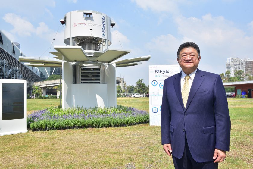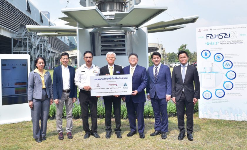 คุณธิติฏฐ์ นันทพัฒน์สิริ กล่าวว่า บริษัทฯ ขอขอบคุณการรถไฟแห่งประเทศไทย รวมทั้ง บริษัท รถไฟฟ้า ร.ฟ.ท. จำกัด ที่ได้ให้การสนับสนุนพื้นที่บริเวณสถานีรถไฟฟ้าแอร์พอร์ต เรล ลิงก์ มักกะสัน สำหรับติดตั้งหอฟอกอากาศระดับเมือง Fahsai 2 ซึ่งเป็นนวัตกรรมของคนไทย พัฒนาโดยศูนย์วิจัยและนวัตกรรมเพื่อความยั่งยืน (RISC) หอฟอกอากาศดังกล่าวพัฒนาขึ้มมาเป็นรุ่นที่ 2 ด้วยเทคโนโลยีหอฟอกอากาศอัตโนมัติแบบไฮบริด (Hybrid Air Purifier Tower) มีขนาดความสูงจากฐาน 5.10 เมตร และฐานขนาด 2.40 เมตร ใช้พลังงานที่ได้จากแผงโซลาร์เซลล์มาใช้ร่วมกันกับระบบพลังงานไฟฟ้าทั่วไป
