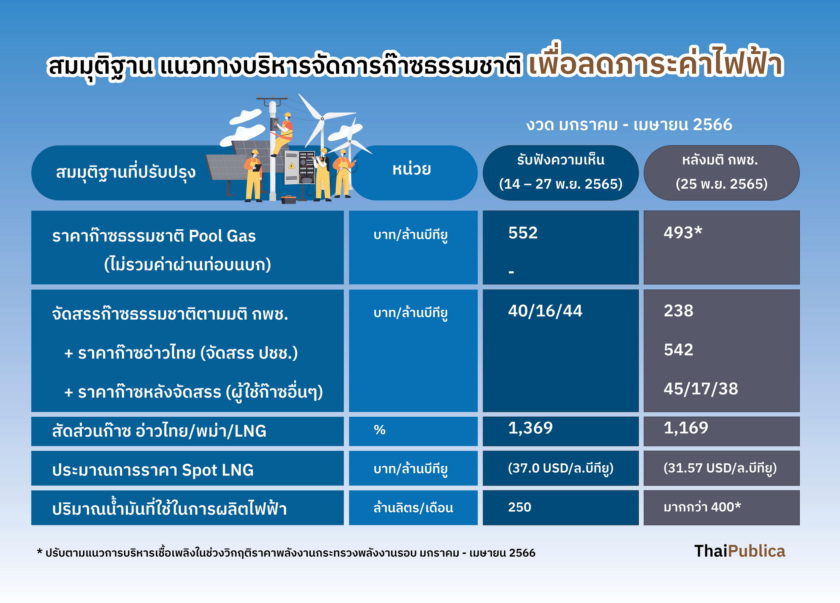 สมมุติฐานและการบริหารเชื้อเพลิงที่ ปตท. และ กฟผ. ปรับปรุงตามแนวทางการบริหารเชื้อเพลิงของกระทรวงพลังงาน เพื่อให้สอดคล้องกับแนวทางบริหารจัดการก๊าซธรรมชาติเพื่อลดภาระค่าไฟฟ้าในช่วงวิกฤตราคาพลังงาน มกราคม – เมษายน 2566 ตามมติ กพช. สรุปได้ดังนี้