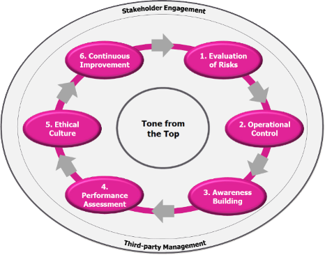 จากสัดส่วนคะแนนจะเห็นว่า Ethisphere มุ่งเน้นในเรื่องของ Ethics & Compliance (E&C) Program ซึ่งเครือฯได้พัฒนากระบวนการขับเคลื่อนในเชิงปฏิบัติครบทั้ง 6 ขั้นตอน เริ่มตั้งแต่ 1) การประเมินความเสี่ยงองค์กรตามกรอบการบริหารความเสี่ยงที่เป็นมาตรฐานสากล ซึ่งครอบคลุมความเสี่ยงด้าน E&C และด้านการทุจริตคอร์รัปชัน 2) การควบคุมการปฏิบัติงานโดยกำหนดนโยบายและแนวปฏิบัติเพื่อการบังคับใช้ทั่วทั้งเครือและจัดให้มีการควบคุมภายใน รวมถึงมีการติดตามและรายงานผลการดำเนินการ 3) การสร้างความตระหนักรู้ด้วยการสื่อสารและฝึกอบรมในเรื่อง E&C ให้กับบุคลากรทุกระดับ พร้อมทั้งพัฒนาสื่อการสอนเพื่อให้กลุ่มธุรกิจนำไปสื่อสารต่อได้ 4) การประเมินผลการปฏิบัติด้าน E&C ซึ่งได้รับการตรวจสอบและประเมินทั้งจากหน่วยงานภายในและหน่วยงานนอก 5) การสร้างวัฒนธรรมด้านจริยธรรม โดยการปลูกฝังผ่านค่านิยมหลัก 6 ประการ และจรรยาบรรณธุรกิจ ซึ่งมีการทบทวนและรับฟังข้อเสนอแนะจากกลุ่มธุรกิจเป็นระยะ และ 6) การปรับปรุงอย่างต่อเนื่อง โดยการประเมินประสิทธิผลการดำเนินงานด้าน E&C สม่ำเสมอและนำผลจากการประเมินมาจัดทำเป็นแผน เพื่อพัฒนาและปรับปรุงกระบวนการด้าน E&C ให้ดียิ่งขึ้น การดำเนินงานทั้ง 6 ด้านนี้เป็นไปตามนโยบายของคณะกรรมการและผู้บริหารระดับสูง ซึ่งได้รับการสนับสนุนจากพนักงานทุกคน เครือฯยังได้นำขั้นตอนทั้ง 6 ด้านนี้ไปบริหารคู่ค้า รวมทั้งสร้างการมีส่วนร่วมกับผู้มีส่วนได้เสียภายนอกอีกด้วย