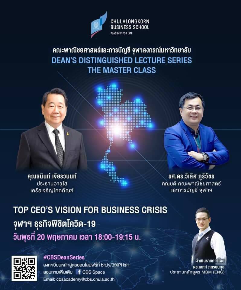 คณะพาณิชยศาสตร์และการบัญชี จุฬาฯ ขอเชิญร่วมงานเสวนาออนไลน์สุดพิเศษ “จุฬาฯ ธุรกิจพิชิต Covid-19” ในหัวข้อ “Top CEO’s Vision for Business Crisis” ซึ่งเป็นส่วนหนึ่งของโครงการ “CBS Dean’s Distinguished Lecture Series: The Master Class” โดยคณะบัญชี จุฬาฯ จัดขึ้นเพื่อให้นักธุรกิจสามารถบริหารจัดการธุรกิจเพื่อพิชิตวิกฤตได้อย่างมีประสิทธิภาพสูงสุดโดยวิทยากรนักธุรกิจชั้นนำของประเทศ