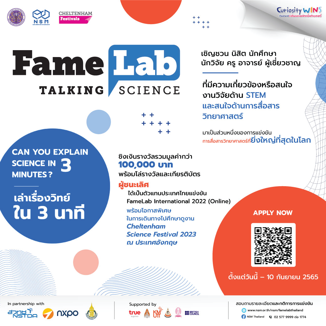 เชิญชวนผู้สนใจ นิสิต นักศึกษา นักวิจัย ครู อาจารย์ ผู้เชี่ยวชาญ ที่มีความเกี่ยวข้องในงานวิจัยด้าน STEM และมีความสนใจด้านการสื่อสารวิทยาศาสตร์ เข้าร่วมโครงการ FameLab Thailand 2022