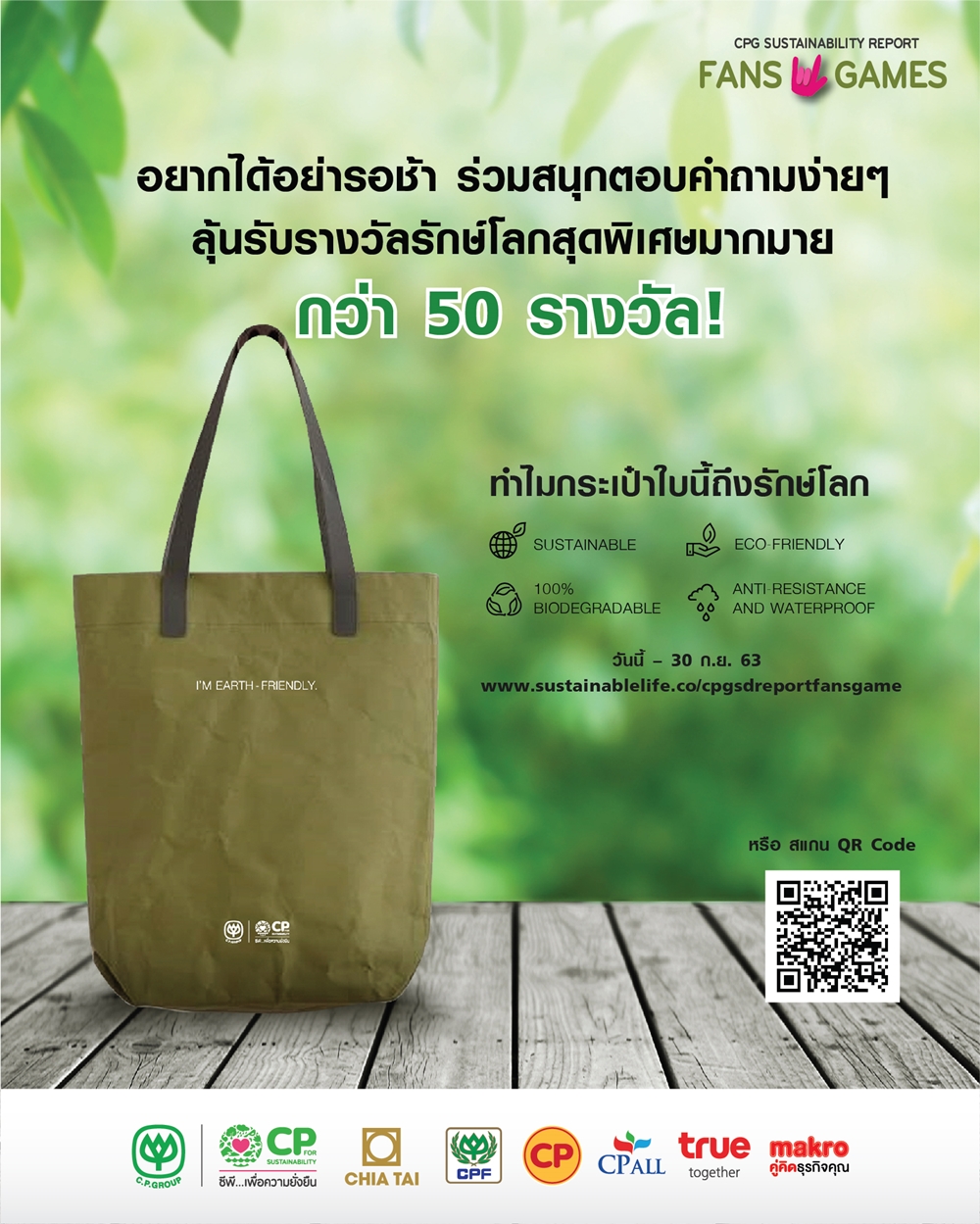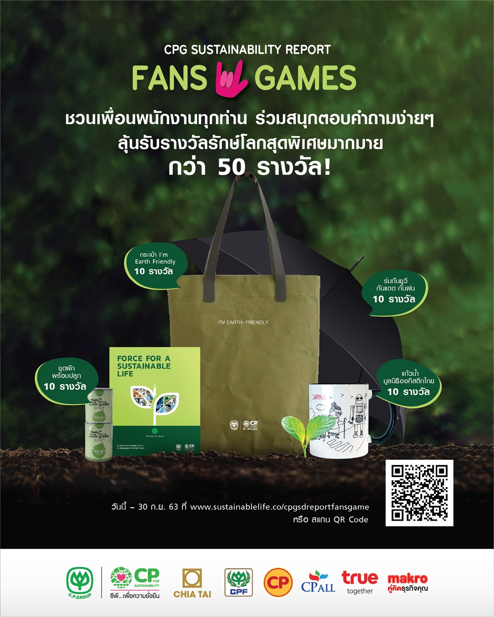 เชิญชวนเพื่อนพนักงานทุกกลุ่มบริษัทในเครือเจริญโภคภัณฑ์ ร่วมสนุกกับกิจกรรม CPG Sustainability Report Fans Game ตามหาสุดยอดแฟนพันธุ์แท้ รายงานความยั่งยืน เครือเจริญโภคภัณฑ์ ด้วยการตอบคำถามง่ายๆ ให้ถูกต้อง เพื่อลุ้นรับรางวัลสุดพิเศษกว่า 50 รางวัล ที่คุณต้องร้องว้าว! อาทิ เช่น กระเป๋า Tote I’m Earth Friendly กระเป๋ารักษ์โลก สามารถย่อยสลายได้เอง 100% เรียบง่าย สไตล์มินิมอล ทนทาน กันน้ำได้ และรางวัลอื่นๆ รวมกว่า 50 รางวัล