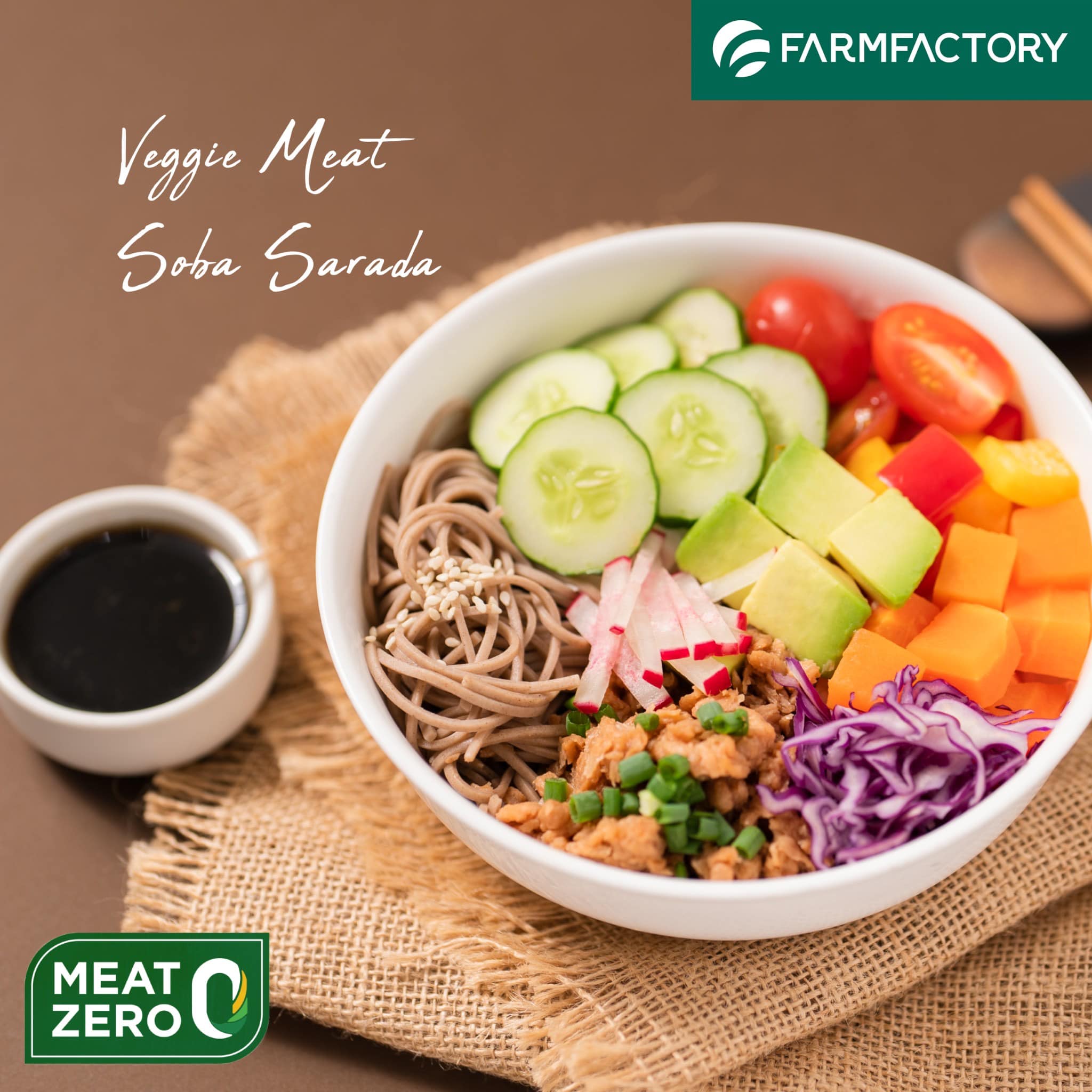 สำหรับ 2 เมนูใหม่ เริ่มที่ ‘Veggie Meat Soba Sarada’ เมนูสลัดเส้นโซบะคลุกเคล้าผักสดและเนื้อบด Plant-Based ได้แรงบันดาลใจมาจากการทานหมี่เย็น ให้ความรู้สึกสดชื่น ราดด้วยโชยุปลาแห้งสูตรพิเศษ กลมกล่อมสไตล์ญี่ปุ่น เหมาะสำหรับคนชอบทานเส้นและผัก ส่วนเมนูที่ 2 คือ ‘Veggie Meat Salad’ โดดเด่นด้วยสลัดแขกรสชาติคุ้นเคย มาพร้อมกับผักสลัดมิกซ์สดกรอบ ความพิเศษอยู่ที่เนื้อบดจากพืชทานคู่น้ำสลัดสีสันจัดจ้าน อร่อยเด็ด สไตล์ FARMFACTORY พิเศษ