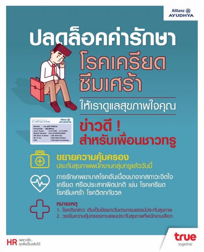 กลุ่มทรูห่วงใยสุขภาพจิตเพื่อนพนักงานปลดล็อคค่ารักษาโรคเครียด โรคซึมเศร้า ขยายความคุ้มครองประกันสุขภาพสำหรับโรคเกี่ยวกับภาวะจิตใจ สามารถเลิกได้ตามแผนประกันสุขภาพที่พนักงานเลือก