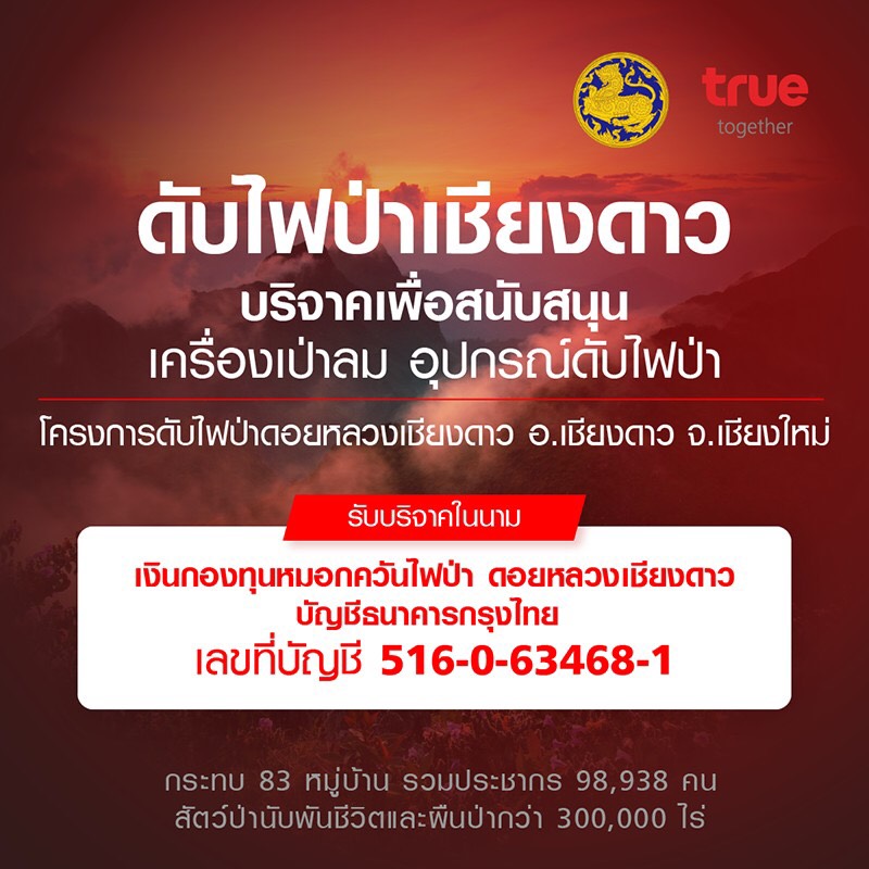 คุณจินดาภรณ์ มะโนวรรณา ผู้จัดการทั่วไป เขตภาคเหนือตอนบน กลุ่มทรู เป็นตัวแทนลูกค้าทรูมูฟ เอช และประชาชนทั่วไป ส่งมอบเงินบริจาค ก้อนแรก จำนวน 150,694.96 บาท โดยมี คุณชัชวาลย์ พุทธโธ นายอำเภอเชียงดาว และคุณรัชพล แก้วจิตคงทอง ปลัดอำเภอเชียงดาว จังหวัดเชียงใหม่ เป็นตัวแทนรับมอบ เพื่อจัดซื้อเครื่องเป่าลมใบไม้ อุปกรณ์ดับไฟป่า จำนวน 14 เครื่อง (ยอดเงินบริจาคตั้งแต่วันที่ 16 มีนาคม – 2 เมษายน 2564 ) สำหรับเจ้าหน้าที่ดับไฟป่า, อาสาสมัคร และชาวบ้าน นำไปใช้ในการดับไฟป่า และเฝ้าระวังไฟป่า ที่เกิดขึ้นอย่างทันท่วงที เพื่อสนับสนุนโครงการดับไฟป่าในเขตพื้นที่ดอยหลวงเชียงดาว อำเภอเชียงดาว จังหวัดเชียงใหม่ จากแคมเปญ ดับไฟป่าเชียงดาว ที่กลุ่มทรู ร่วมกับกระทรวงมหาดไทย โดยเชิญชวนลูกค้า ทรูมูฟ เอช และประชาชนทั่วไป บริจาคผ่านบัญชีธนาคาร ในนาม เงินกองทุนหมอกควันไฟป่า ดอยหลวงเชียงดาว