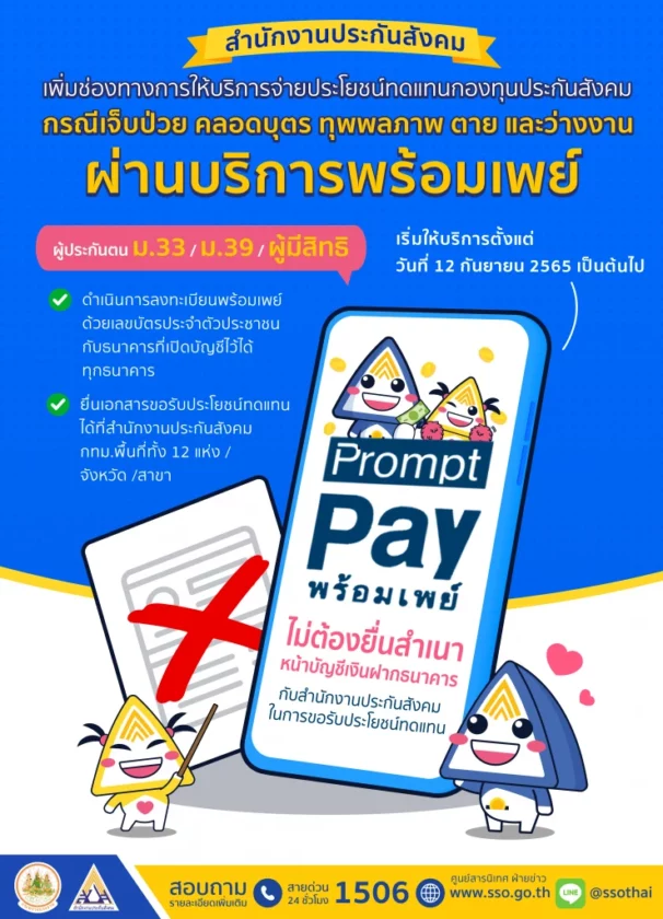 โดยผู้ประกันตนไม่ต้องยื่นสำเนาหน้าบัญชีเงินฝากธนาคารกับสำนักงานประกันสังคม ในการขอรับประโยชน์ทดแทนดังกล่าว อีกทั้งเป็นการลดการใช้กระดาษ (Paperless) ตามนโยบายรัฐบาล อีกด้วย ทั้งนี้ ผู้ประกันตนสามารถลงทะเบียนพร้อมเพย์ด้วยเลขบัตรประจำตัวประชาชนกับธนาคารที่ผู้ประกันตนเปิดบัญชีไว้ได้ทุกธนาคาร โดยสำนักงานประกันสังคมเริ่มให้บริการจ่ายประโยชน์ทดแทน ตั้งแต่วันที่ 12 กันยายน 2565 นี้เป็นต้นไป