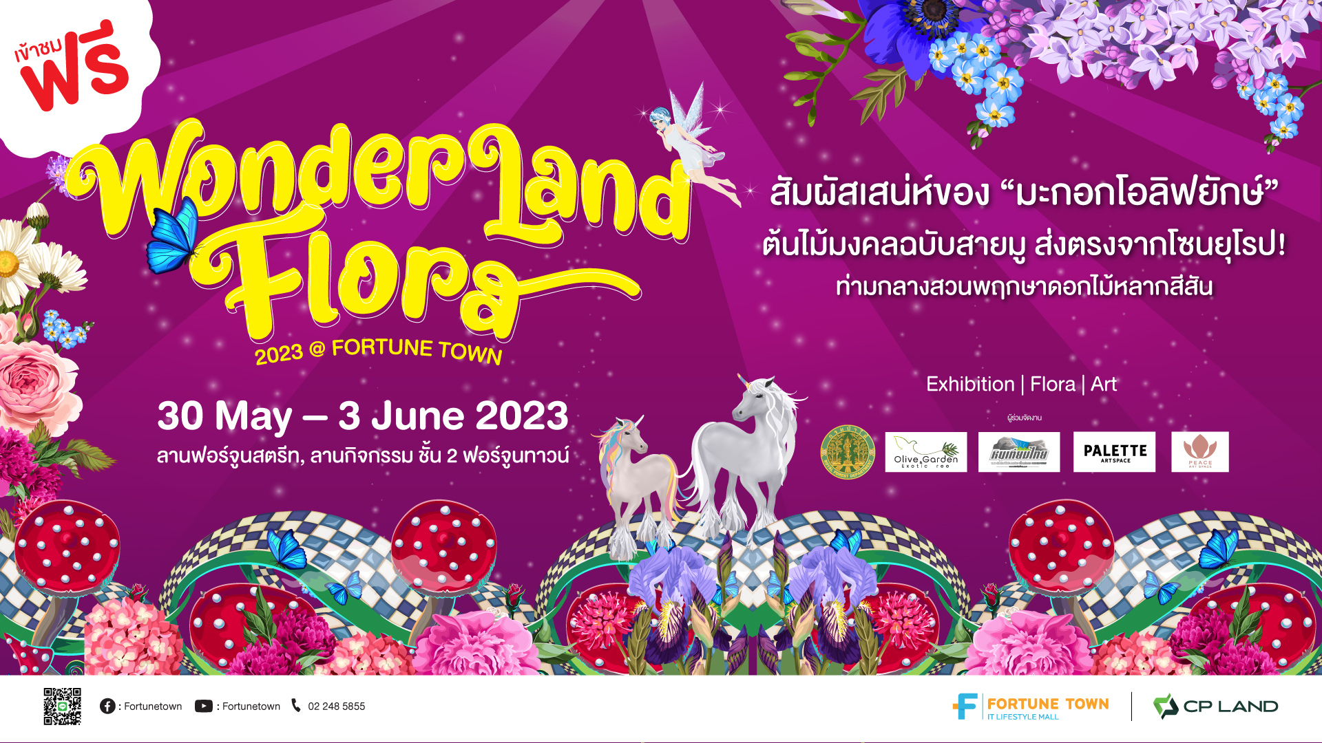23 พฤษภาคม 2566, กรุงเทพฯ – ฟอร์จูนทาวน์ (Fortune Town) ศูนย์รวมไอทีและไลฟ์สไตล์ชั้นนำย่าน รัชดา-พระราม 9 ภายใต้บริษัท ซี.พี. แลนด์ จำกัด (มหาชน) หรือ CP LAND เนรมิตพื้นที่ให้กลายเป็นดินแดนแห่งดอกไม้หลากสีสัน ชวนสัมผัสเสน่ห์ของ “มะกอกโอลิฟยักษ” ต้นไม้มงคลฉบับสายมูส่งตรงจากโซนยุโรป เพลิดเพลินไปกับนิทรรศการงานศิลปะ และกิจกรรมอีกมากมาย ในงาน Wonderland Flora 2023 @FORTUNE TOWN ตั้งแต่วันที่ 30 พฤษภาคม – 3 มิถุนายน 2566 ที่บริเวณลานกิจกรรมชั้น 2 และลานฟอร์จูนสตรีท ฟอร์จูนทาวน์ รัชดา-พระราม9