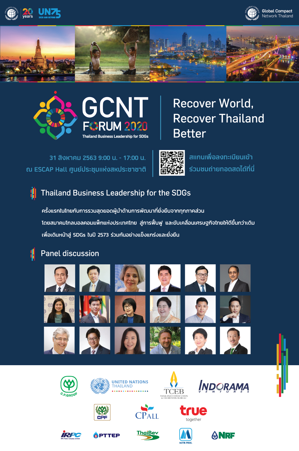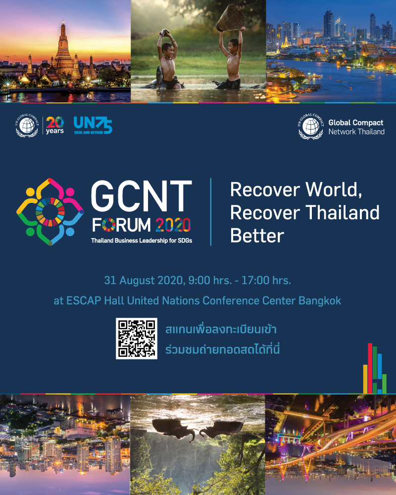 สมาคมเครือข่ายโกลบอลคอมแพ็กแห่งประเทศไทย เครือข่ายด้านความยั่งยืนที่ใหญ่ที่สุดในประเทศ เตรียมจัดงาน “GCNT FORUM 2020: Thailand Business Leadership for SDGs” สัมมนาผู้นำภาคธุรกิจไทย ภายใต้แนวคิดหลัก Recover world, recover Thailand better ระดมพลังความยั่งยืนฟื้นเศรษฐกิจของประเทศ หลัง COVID-19 ในโอกาสครบรอบ 20 ปีของเครือข่ายโกลบอลคอมแพ็กแห่งสหประชาชาติ และครบรอบ 75 ปีสหประชาชาติ