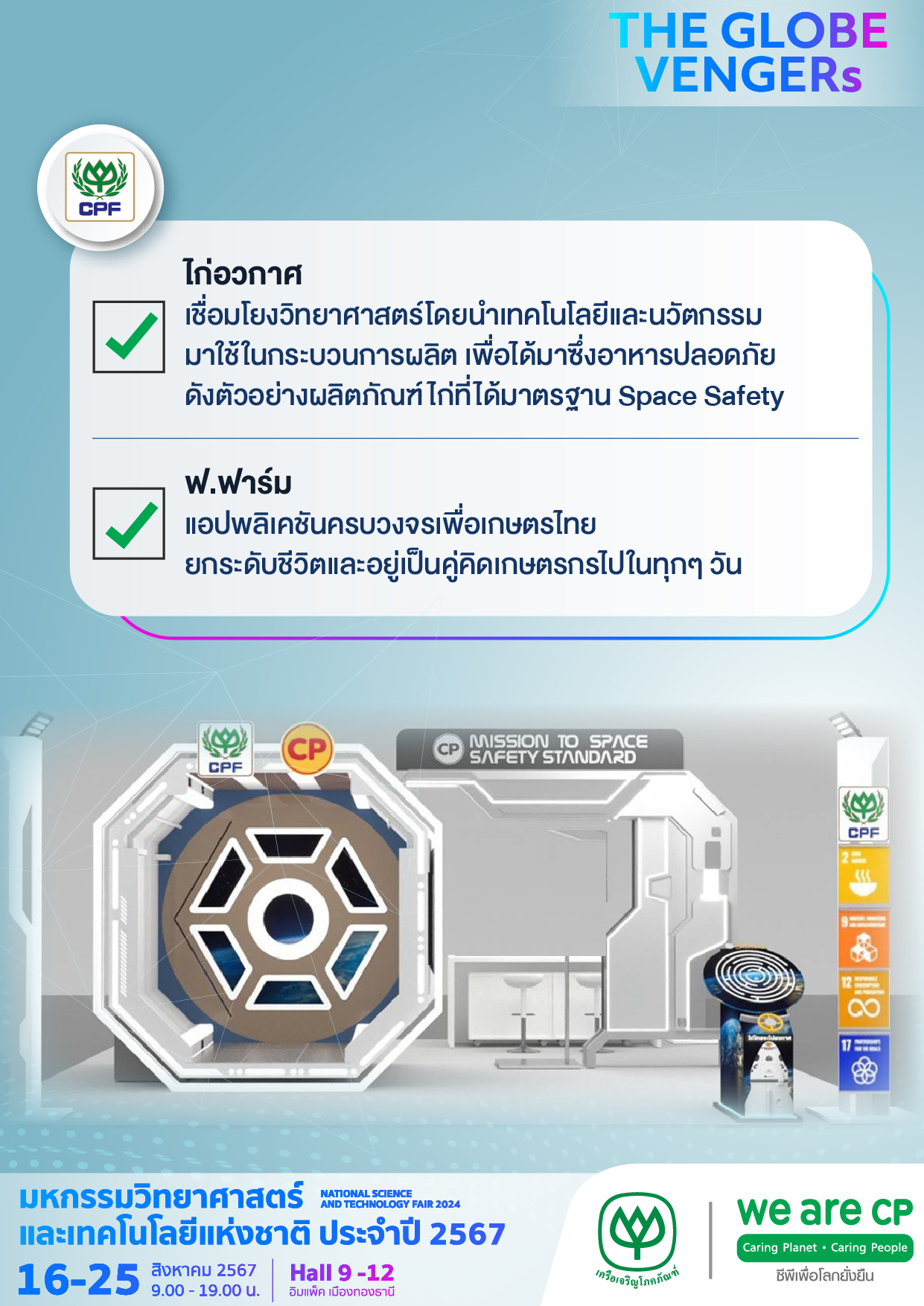 โดยมีเนื้อหาและความน่าสนใจภายในบูธ เจริญโภคภัณฑ์อาหาร หรือ ซีพีเอฟ – สื่อสารเรื่อง Sustainovation เชื่อมโยงวิทยาศาสตร์โดยนำเทคโนโลยีและนวัตกรรมมาใช้ในกระบวนการผลิตเพื่อได้มาซึ่งอาหารปลอดภัย ดังตัวอย่างผลิตภัณฑ์ไก่ที่ได้มาตรฐาน Space Safety