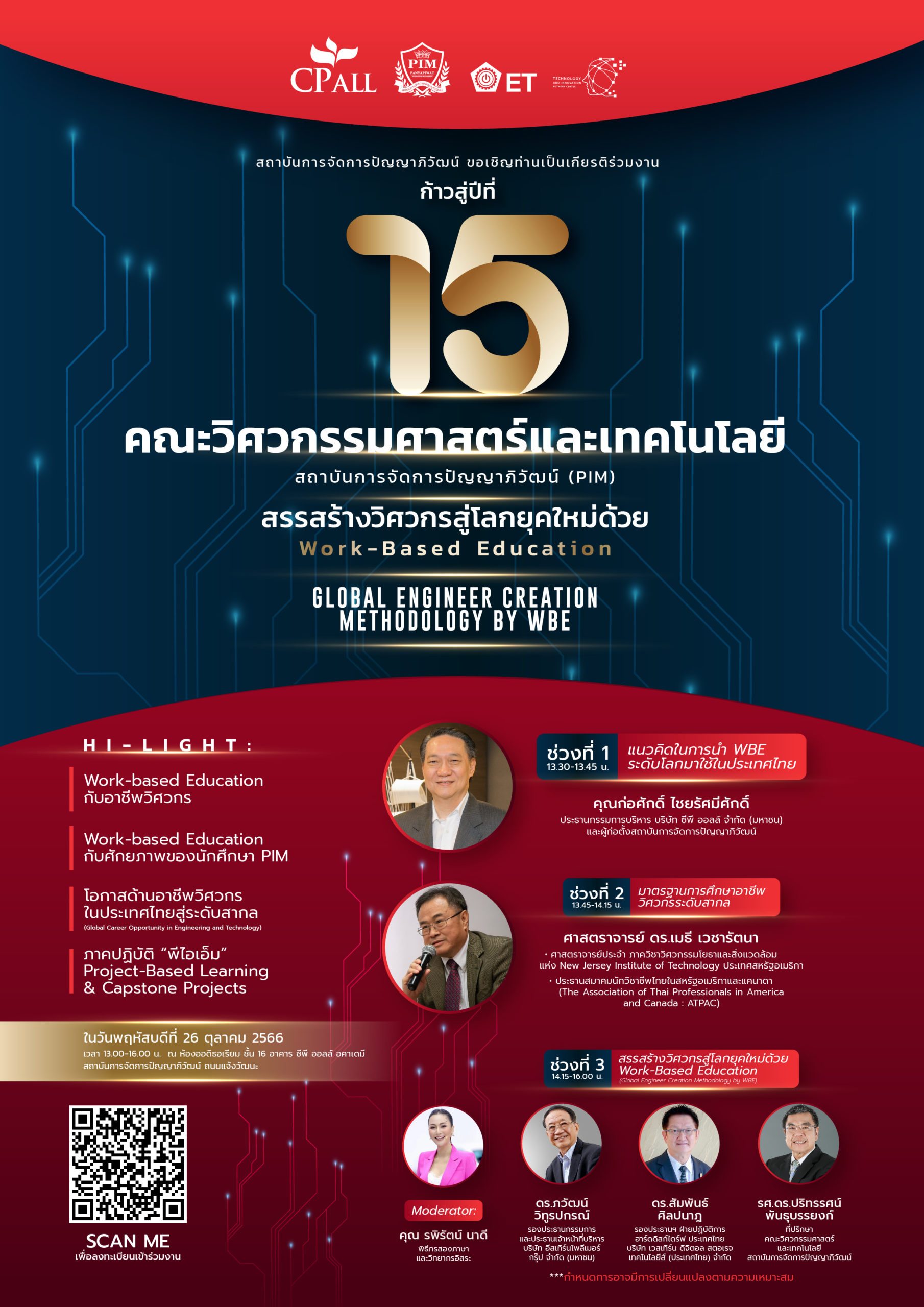 คณะวิศวกรรมศาสตร์และเทคโนโลยี สถาบันการจัดการปัญญาภิวัฒน์ (พีไอเอ็ม) ขอเชิญร่วมงานเสวนาภายใต้หัวข้อเรื่อง “สรรสร้างวิศวกรสู่โลกยุคใหม่ด้วย Work–based Education” (Global Engineer Creation Methodology by WBE) เพื่อแลกเปลี่ยนเรียนรู้การสร้างบุคลากรด้านวิศวกรรมอย่างมีคุณภาพ เนื่องในโอกาสก้าวเข้าสู่ปีที่ 15 ของคณะวิศวกรรมศาสตร์และเทคโนโลยี โดยได้รับเกียรติจาก คุณก่อศักดิ์ ไชยรัศมีศักดิ์ ประธานกรรมการบริหาร บริษัท ซีพี ออลล์ จำกัด (มหาชน) กล่าวปาฐกถาเปิดงาน หัวข้อ “แนวคิดในการนำ Work–based Education ระดับโลกมาใช้ในประเทศไทย” พร้อมด้วย ศาสตราจารย์ ดร.เมธี เวชารัตนา ศาสตราจารย์ประจำ ภาควิชาวิศวกรรมโยธา และสิ่งแวดล้อม แห่ง New Jersey Institute of Technology ประเทศสหรัฐอเมริกา ประธานสมาคมนักวิชาชีพไทยในสหรัฐอเมริกา และแคนาดา (The Association of Thai Professionals in America and Canada : ATPAC) กล่าวปาฐกถาหัวข้อ “มาตรฐานการศึกษาอาชีพวิศวกรระดับสากล” สำหรับช่วงเสวนา นำโดยวิทยากรผู้ทรงคุณวุฒิ ดร.ภวัฒน์ วิทูรปกรณ์ รองประธานกรรมการ และประธานเจ้าหน้าที่บริหาร บริษัท อีสเทิร์นโพลีเมอร์ กรุ๊ป จำกัด (มหาชน) ดร.สัมพันธ์ ศิลปนาฏ รองประธานกรรมการฝ่ายปฏิบัติการ ฮาร์ดดิสก์ไดร์ฟ ประเทศไทย บริษัท เวสเทิร์น ดิจิตอล สตอเรจ เทคโนโลยีส์ (ประเทศไทย) จำกัด และ รองศาสตราจารย์ ดร.ปริทรรศน์ พันธุบรรยงก์ ที่ปรึกษาคณะวิศวกรรมศาสตร์และเทคโนโลยี สถาบันการจัดการปัญญาภิวัฒน์ ดำเนินรายการโดย คุณรพิพัฒน์ นาดี และบูธเครือข่ายพันธมิตรจากองค์กรชั้นนำร่วมแสดงเทคโนโลยี อาทิ Liugong, Mitsubishi Electric Factory Automation – Thailand, ABB, SMC (Thailand), Yaskawa, ณ ห้อง Auditorium ชั้น 16 อาคาร CP ALL Academy สถาบันการจัดการปัญญาภิวัฒน์ ถนนแจ้งวัฒนะ ฟรี! ไม่มีค่าใช้จ่าย