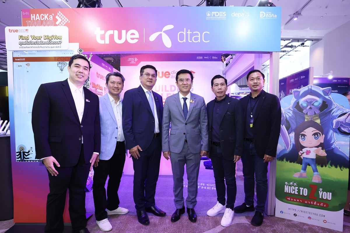 กรุงเทพฯ 25 สิงหาคม 2566 – นายชัยวุฒิ ธนาคมานุสรณ์ (ที่3 จากขวา) รัฐมนตรีว่าการกระทรวงดิจิทัลเพื่อเศรษฐกิจและสังคม (ดีอีเอส) ร่วมด้วย ผศ.ดร.ณัฐพล นิมมานพัชรินทร์ (ที่2 จากขวา) ผู้อำนวยการใหญ่ สำนักงานส่งเสริมเศรษฐกิจดิจิทัล (ดีป้า) ชมศักยภาพระบบนิเวศดิจิทัลส่งเสริมการพัฒนาคนให้มีคุณภาพและมีทักษะดิจิทัล (Digital Talent) เพื่อขับเคลื่อนประเทศไทยสู่แถวหน้าของเศรษฐกิจดิจิทัล ที่บูธทรู คอร์ปอเรชั่น โดยมี นายจักรกฤษณ์ อุไรรัตน์ (ที่ 3 จากซ้าย) รักษาการหัวหน้าคณะผู้บริหารด้านกิจการองค์กร บมจ. ทรู คอร์ปอเรชั่น พร้อมคณะผู้บริหารให้การต้อนรับในงาน HACKaTHAILAND 2023: DIGITAL INFINITY ณ ศูนย์การประชุมแห่งชาติสิริกิติ์