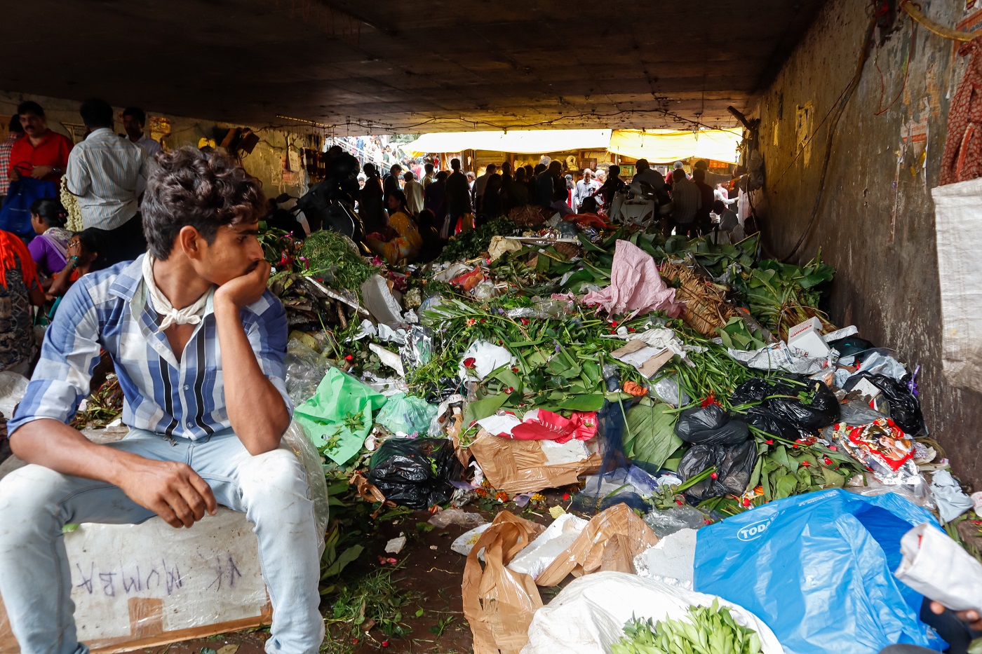 ขยะดอกไม้จากพิธีกรรมต่าง ๆ ในกัลกัตตา อินเดีย (ปี 2019)