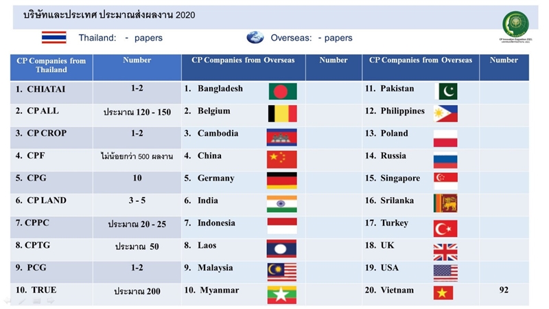 รายงานข่าวจากคณะกรรมการประสานงานมหกรรมนวัตกรรมบัวบาน 2021 เครือเจริญโภคภัณฑ์เปิดเผยว่าจนถึง ณ วันที่ 10 มกราคม 2563 หลายหน่วยงานของกลุ่มธุรกิจต่างๆของเครือเจริญโภคภัณฑ์ อาทิเช่น ซีพีเวียดนาม ซีพีเอฟ แม็คโคร ทรู CPG CPTG PCG ทยอยลงทะเบียนส่งผลงานนวัตกรรมทั้ง 3 ด้านได้แก่ด้านเศรษฐกิจ ด้านเทคโนโลยีและด้านสังคมและสิ่งแวดล้อม 104 ผลงานแล้ว ทั้งนี้กำหนดการรับผลงานภายในวันที่ 29 กุมภาพันธ์