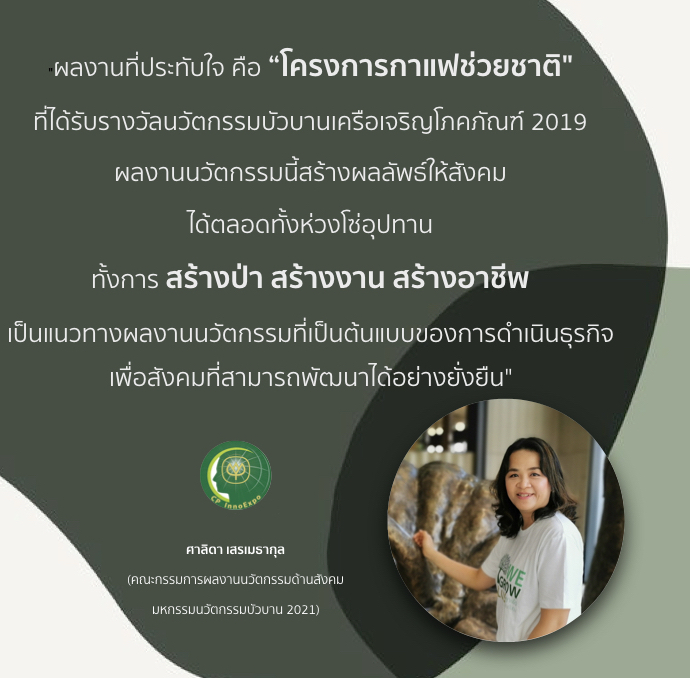 คุณศาลิดา ได้ยกตัวอย่างถึงผลงานนวัตกรรมบัวบานด้านสังคมที่มีความประทับใจ คือ “โครงการกาแฟช่วยชาติ” โดยบริษัท ซีพี รีเทลลิงค์ จำกัด ที่ได้รับรางวัลมหกรรมนวัตกรรมบัวบานเครือเจริญโภคภัณฑ์ 2019 หรือ Chairman Award โดยจุดเด่นของผลงานชิ้นนี้แตกต่างจากผลงานนวัตกรรมอื่น คือ ตัวผลงานนวัตกรรมอยู่ในกระบวนการทางธุรกิจ แต่สามารถสร้าง “ผลลัพธ์” ให้สังคมได้ตลอดทั้งห่วงโซ่อุปทาน ตามที่ผลงานได้อธิบายถึงกลไกที่มีบทบาทตั้งแต่ต้นน้ำ กลางน้ำ และปลายน้ำ ทั้งการสร้างป่า สร้างงาน สร้างอาชีพ และปัจจุบันโครงการนี้ได้มีการขยายสาขาในอาคารและโครงการต่างๆ เช่น อาคาร ซี.พี.ทาวเวอร์ และศูนย์ประชุมและแสดงสินค้านานาชาติขอนแก่น เป็นต้น ซึ่งถือเป็นแนวทางผลงานนวัตกรรมที่เป็นต้นแบบของการดำเนินธุรกิจเพื่อสังคมที่สามารถพัฒนาได้ยั่งยืน