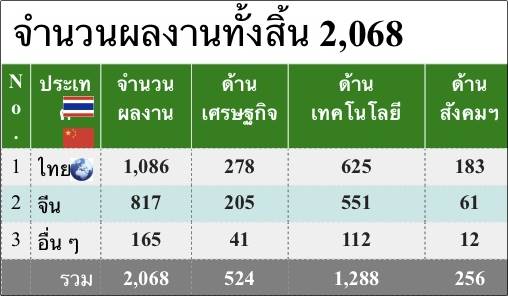 ทั้งนี้หากแยกผลงานแต่ละด้าน 1.ผลงานนวัตกรรมด้านเศรษฐกิจ รวม 524 ผลงาน เป็นของประเทศไทย 278 ผลงาน จีน 205 ผลงานและประเทศอื่นๆ 41 ผลงาน 2.ผลงานด้านเทคโนโลยี 1,288 ผลงาน เป็นของประเทศไทย 625 ผลงาน จีน 551 ผลงาน และประเทศอื่นๆ112 ผลงาน 3.ผลงานด้านสังคมและสิ่งแวดล้อม เป็นของประเทศไทย 183 ผลงานจีน 61 ผลงานและประเทศอื่นๆ 12 ผลงาน